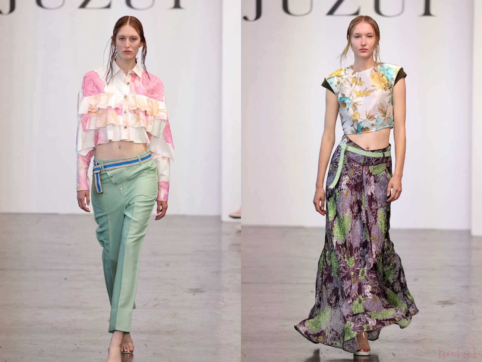 這兩場(chǎng)秀展示的新品均以芍藥為設(shè)計(jì)靈感,因?yàn)椤盎ā笔侨缃窬磷讼胍蛟斓臉?biāo)志性品牌基因。這是由2023年加入玖姿的品牌創(chuàng)意總監(jiān)王陶(Taoray Wang)主導(dǎo)的年輕化革新。