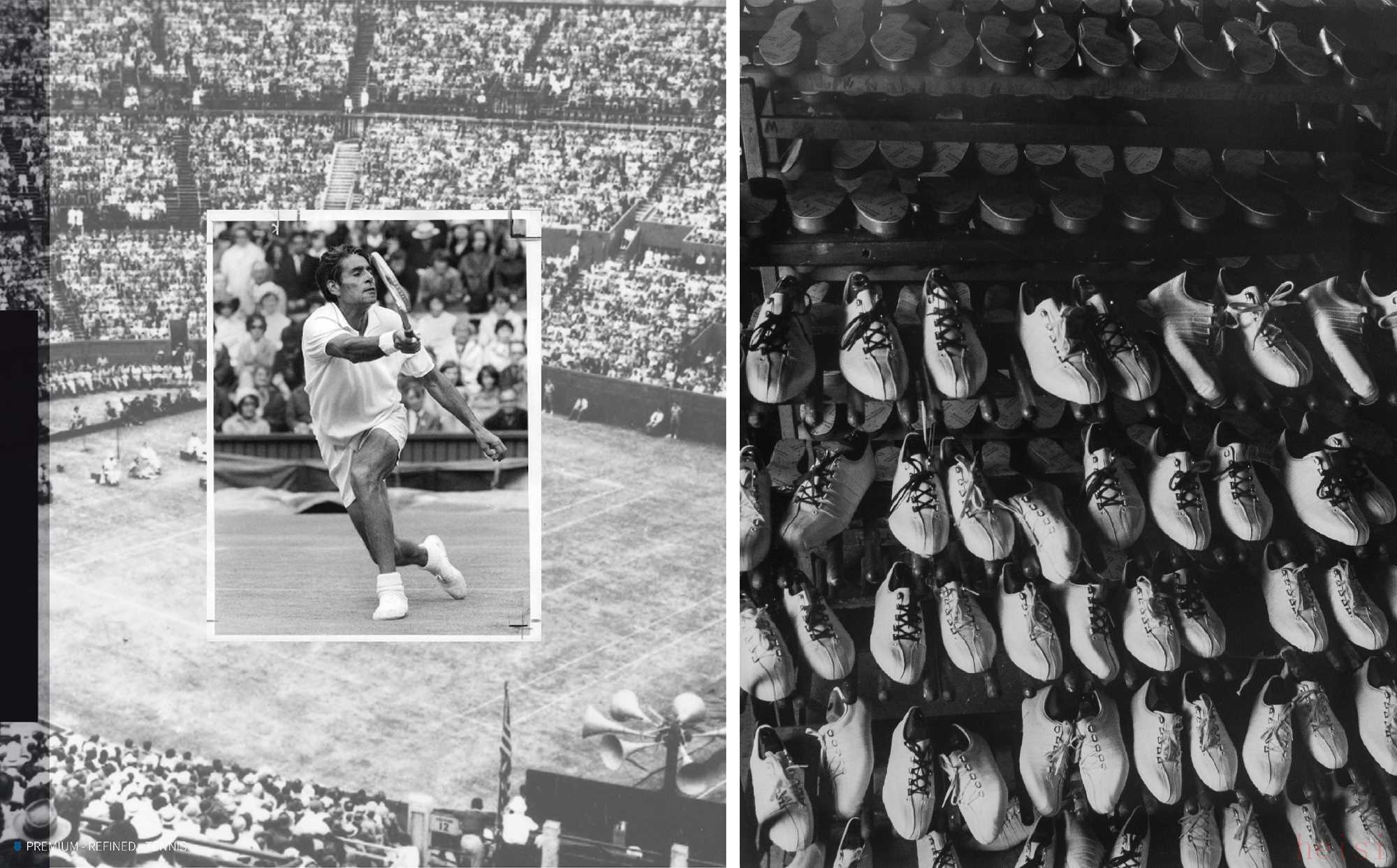 網(wǎng)球場上有獨(dú)一份的運(yùn)動(dòng)準(zhǔn)則,需要運(yùn)動(dòng)員不斷急停急起,靈活地應(yīng)對(duì)挑戰(zhàn),這對(duì)運(yùn)動(dòng)鞋的支撐和穩(wěn)定性有著極高要求。瑞士兄弟從故鄉(xiāng)的滑雪靴設(shè)計(jì)中汲取靈感,以五道杠結(jié)構(gòu)和D-Ring系帶系統(tǒng)為核心設(shè)計(jì)元素,并用柔韌的優(yōu)質(zhì)皮料代替當(dāng)時(shí)主流的帆布面料,穩(wěn)穩(wěn)承托住運(yùn)動(dòng)員在球場上劇烈的側(cè)向移動(dòng),打造出全球第一雙真皮網(wǎng)球鞋,同時(shí)也是網(wǎng)球史上具有里程碑意義的CLASSIC 66 鞋款。