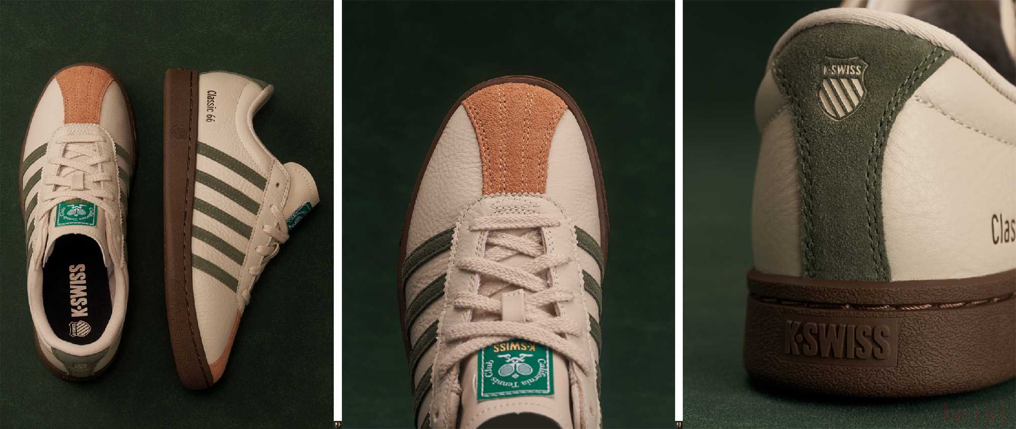 NEW CLASSIC 66 還用精妙的色彩語言,訴說著K·SWISS的深厚文化底蘊(yùn):「草地綠」配色,讓米白與綠茵交織,重現(xiàn)來自溫布爾登的優(yōu)雅印記;「白紅傳奇」作為美式復(fù)古的標(biāo)準(zhǔn)答案,彰顯品牌血統(tǒng);「經(jīng)典米」則是以黑白撞色與經(jīng)典牛筋棕相襯,復(fù)刻OG的美學(xué)語言。