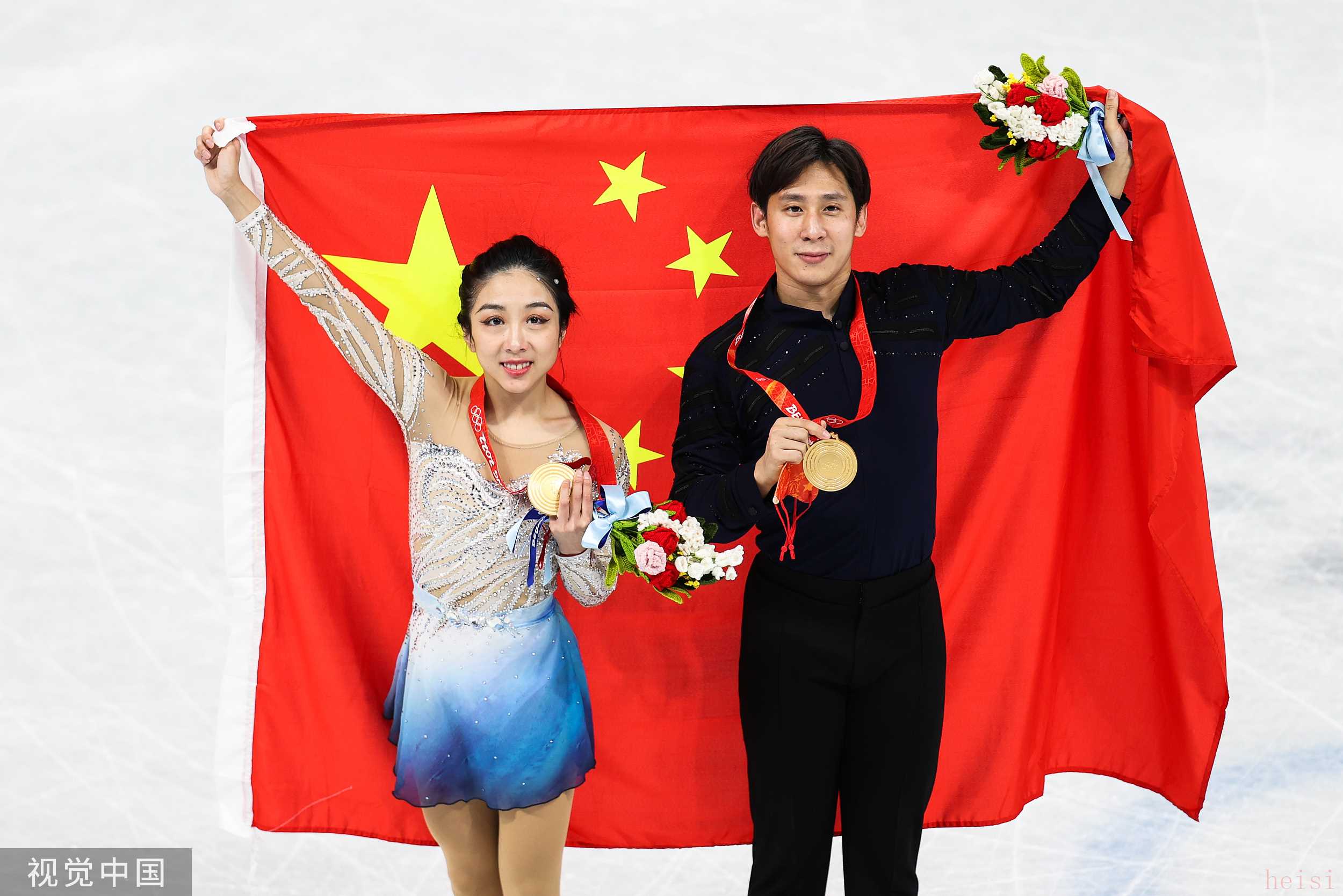 隋文靜/韓聰舉國(guó)旗展示金牌。(圖源視覺中國(guó))