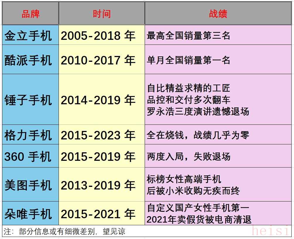 這其中還有不少是過去聲名大噪的品牌,比如中興、朵唯、金立、天語、酷派和錘子手機等。