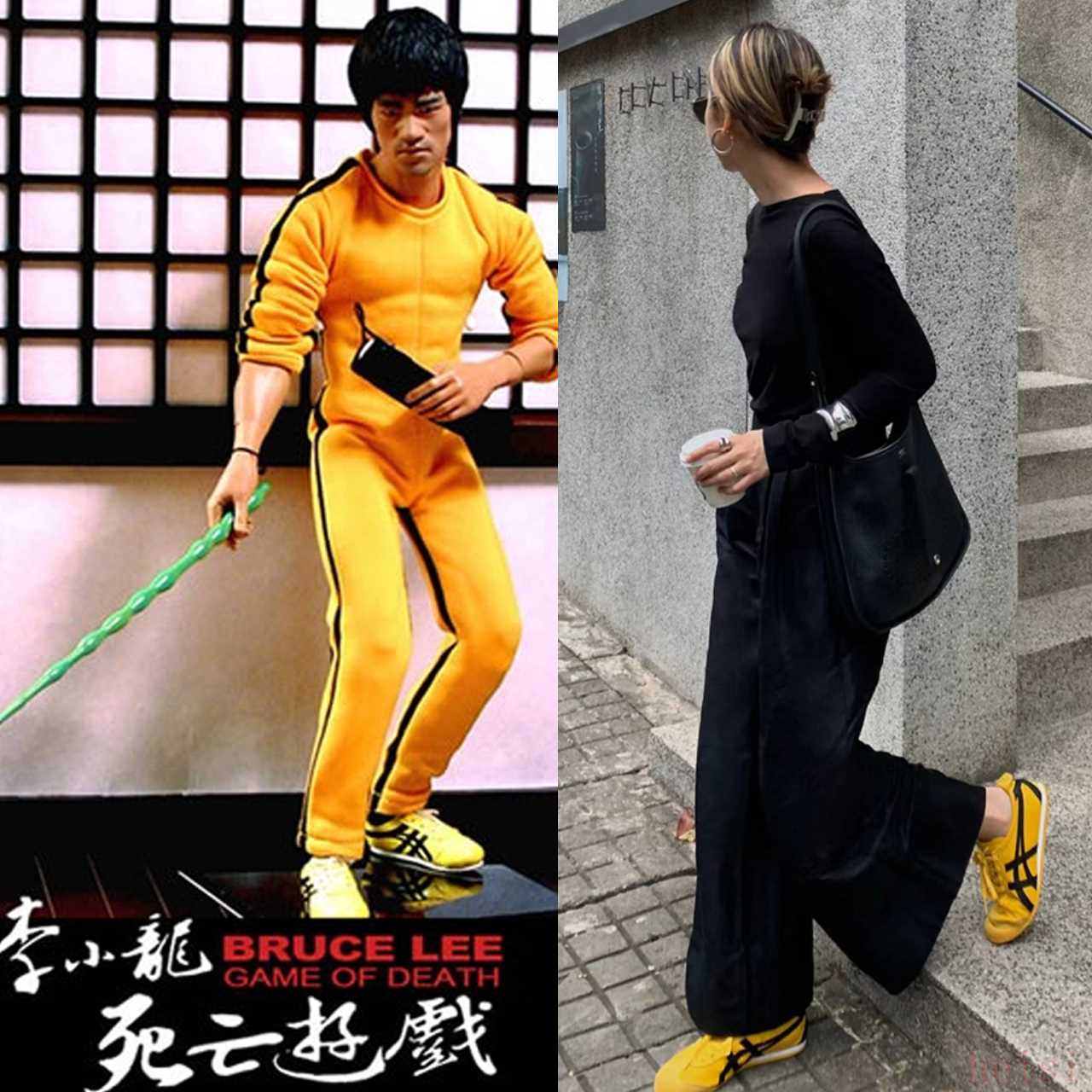 服裝顏色可以暗一點,將顏色重點放在鬼塚虎鞋子上,比如黑色服裝搭配黃色鬼塚虎,突出鞋子李小龍配色特點,冷暖色結(jié)合看著更高級。