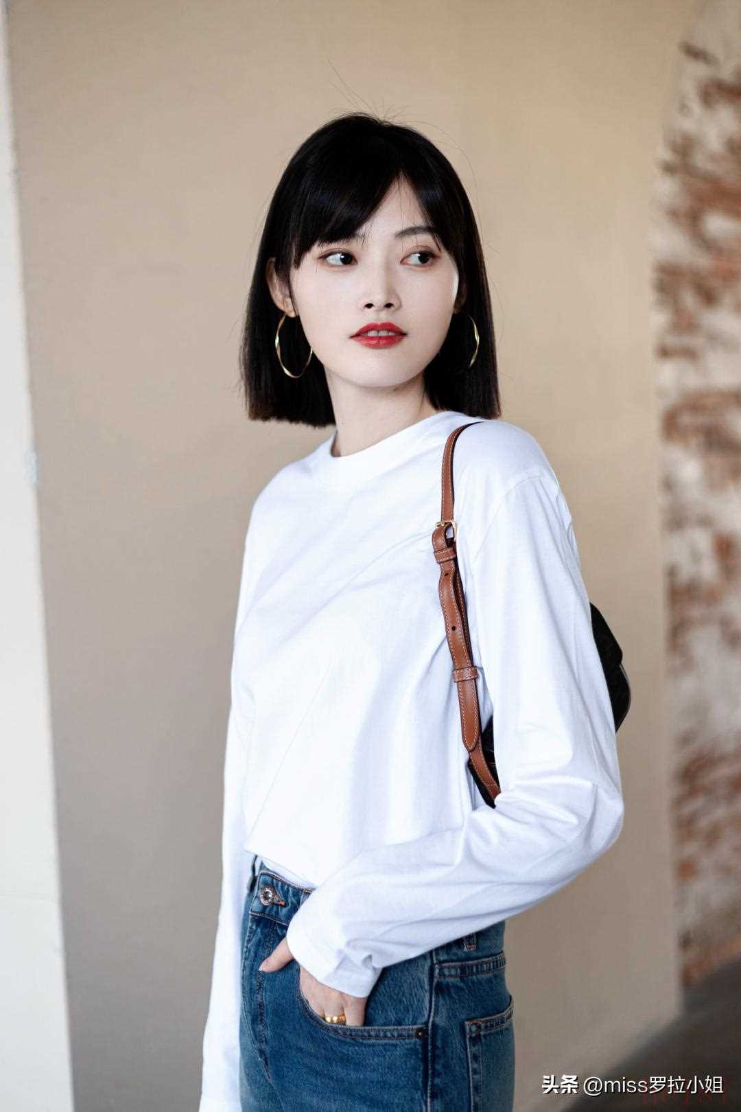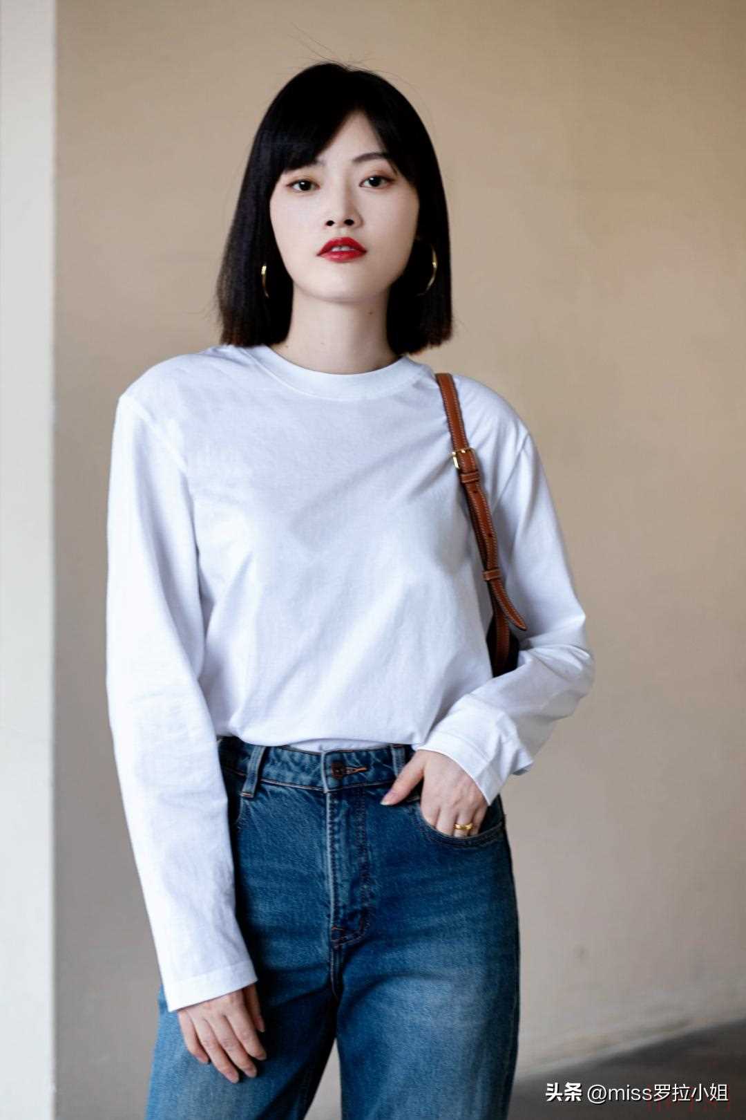 大婷,158cm/44kg,穿S碼除了以上兩種搭配,白色T恤+牛仔褲也是極簡風穿搭的經(jīng)典組合。