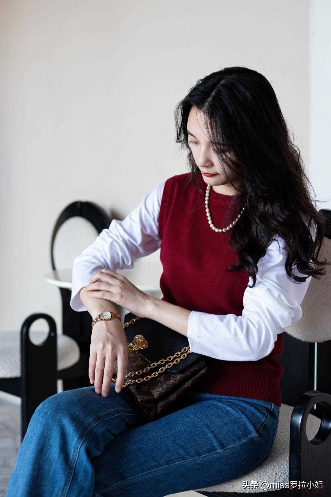 于是她自己挑了兩件毛衣馬甲來搭配這件圓領長袖白T,一搭配馬上就有了復古的韻味。