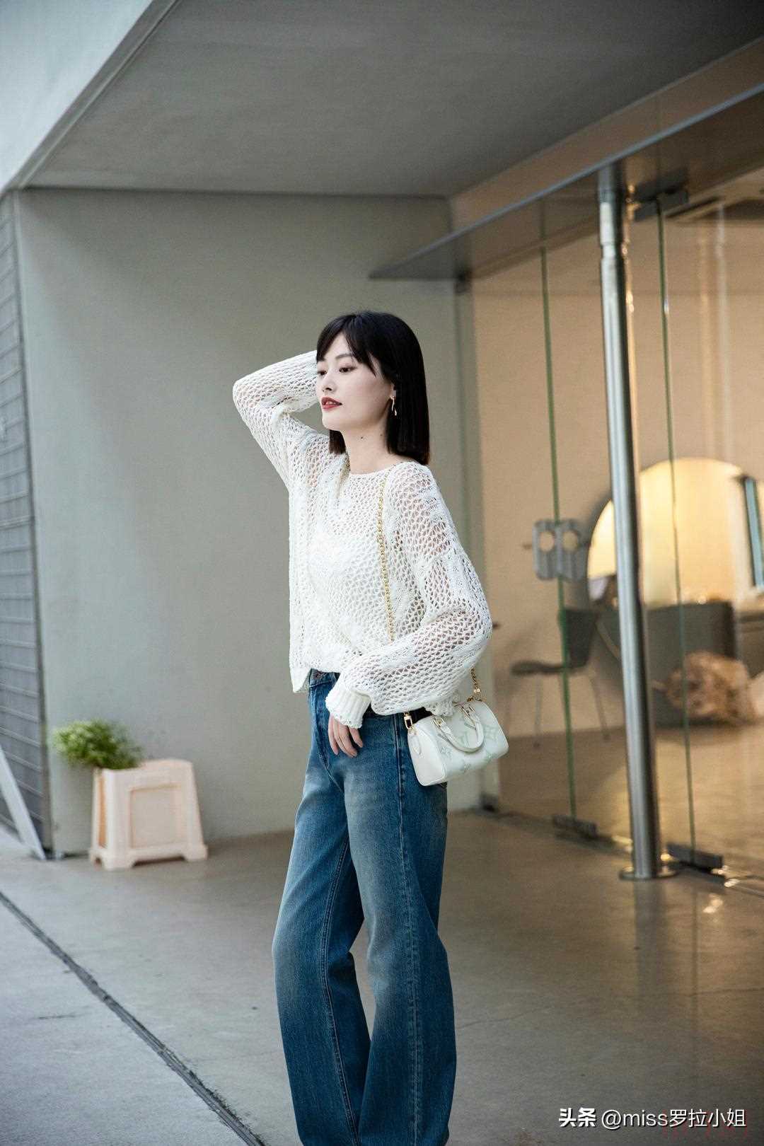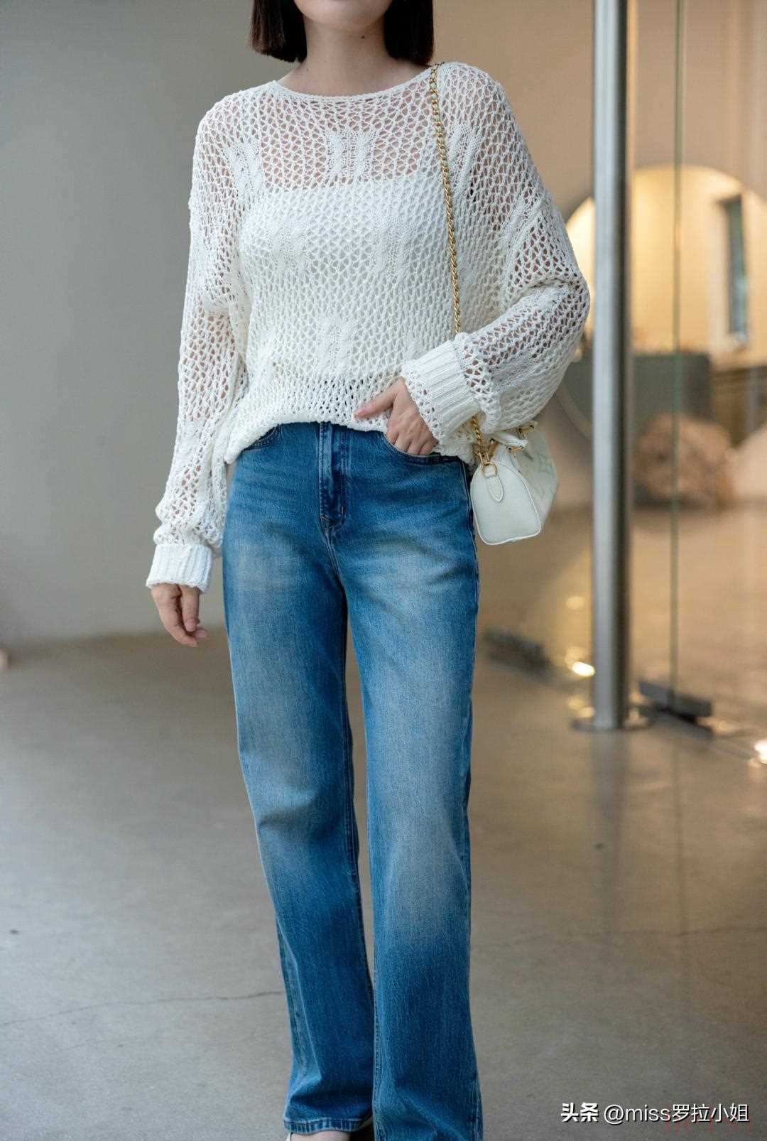鏤空針織上衣+牛仔褲的搭配就很現(xiàn)代混搭風。