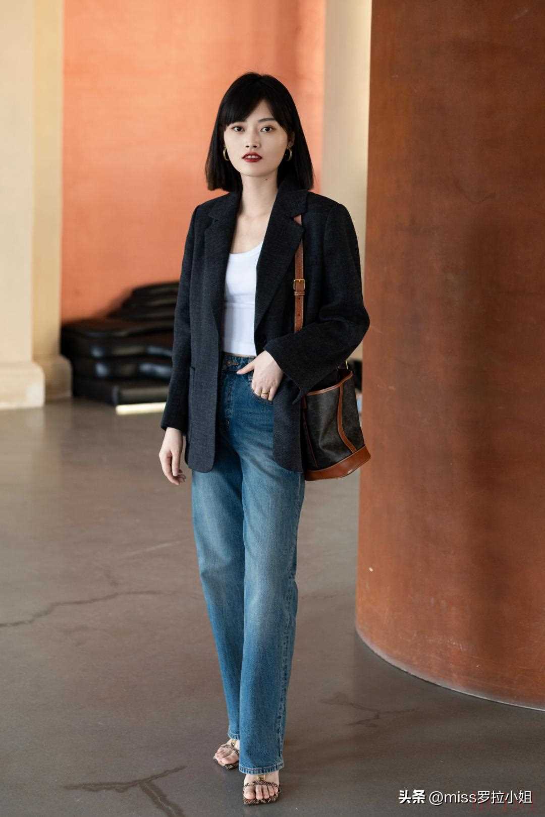 除了搭配簡單經(jīng)典的上衣走極簡風外,還可以選擇一些比較時髦的休閑單品和牛仔褲搭配,讓整體造型更有時髦感。
