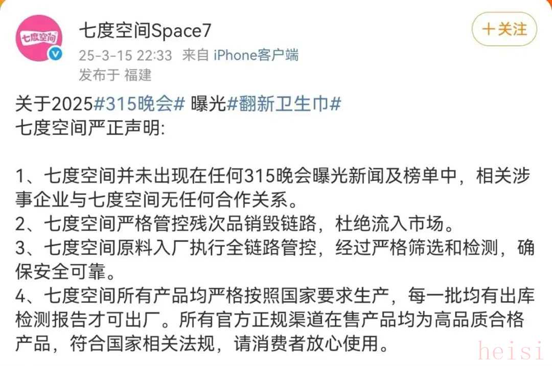 護(hù)舒寶品牌回應(yīng):晚會(huì)曝光品牌完全不涉及護(hù)舒寶,護(hù)舒寶所有官方正規(guī)渠道市售產(chǎn)品均安全高品質(zhì),符合國(guó)家相關(guān)法規(guī),消費(fèi)者可以放心使用。此外,七度空間深夜10時(shí)許也發(fā)布嚴(yán)正聲明:七度空間并未出現(xiàn)在任何315晚會(huì)曝光新聞及榜單中,相關(guān)涉事企業(yè)與七度空間無(wú)任何合作關(guān)系,所有官方正規(guī)渠道在售產(chǎn)品均為高品質(zhì)合格產(chǎn)品,符合國(guó)家相關(guān)法規(guī),請(qǐng)消費(fèi)者放心使用。