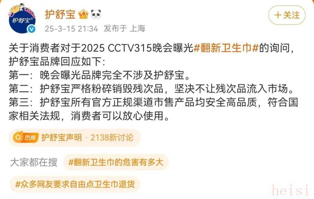 當(dāng)晚,某購(gòu)物平臺(tái)上的“好之旗艦店”客服表示,“關(guān)于報(bào)道中提到的非法回收和翻新行為,屬于不法分子對(duì)正規(guī)企業(yè)殘次品的非法操作,與好之本身的產(chǎn)品質(zhì)量無(wú)關(guān)。”該客服表示,目前,該品牌所在的企業(yè)已采取法律手段追究相關(guān)責(zé)任方的違法行為,并成立專項(xiàng)調(diào)查小組進(jìn)行全面徹查。“米菲母嬰旗艦店”客服則表示:“有不法黑心商家鉆漏洞,利用我們米菲品牌紙尿褲的廢品制作不合格的產(chǎn)品,我們嚴(yán)厲譴責(zé)并保留訴諸法律的權(quán)利。”“EMXEE嫚熙官方旗艦店”客服表示,一次性內(nèi)褲的生產(chǎn)在無(wú)塵消毒車間完成,裝入單獨(dú)包裝后再由機(jī)器智能封袋,再全部進(jìn)入到EO環(huán)氧乙烷消毒車間進(jìn)行至少8個(gè)小時(shí)以上的消毒。“自由點(diǎn)”發(fā)布聲明稱,自由點(diǎn)堅(jiān)決打擊非法回收、翻新、銷售殘次品以及制假售假違法行為,針對(duì)本次315提及的梁山希希紙制品有限公司違法回收自由點(diǎn)殘次料翻新售假行為,自由點(diǎn)已成立專項(xiàng)調(diào)查組進(jìn)行全面調(diào)查并將在第一時(shí)間向公安機(jī)關(guān)報(bào)案。另外,記者還注意到,一些與報(bào)道無(wú)關(guān)的知名衛(wèi)生巾企業(yè),也在深夜紛紛發(fā)表了聲明。
