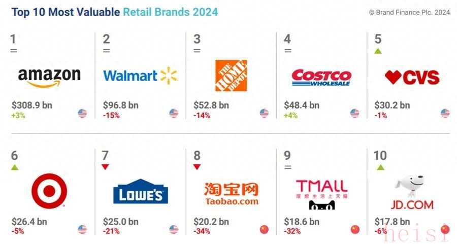 英國品牌評估機構(gòu)“品牌金融”(Brand Finance)發(fā)布“2024全球零售品牌價值100強”排行榜(Retail 100 2024)。美國品牌亞馬遜、沃爾瑪、家得寶蟬聯(lián)前三。中國品牌淘寶、天貓和京東進入十強。上榜的中國零售品牌還有:美團、阿里巴巴、永輝和唯品會。Brand Finance使用特許費率法計算品牌在其排名表中的價值。此方法通過計算出一個品牌的特許費率來估計未來可歸因于專利使用的收入,以達成“品牌價值”??蓪⑵淅斫鉃樵S可人在開放市場通過品牌授權(quán)可獲得的凈經(jīng)濟利益。1、亞馬遜(Amazon.com) 美國 3089.26億美元/+3.2% 2、沃爾瑪(Walmart) 美國 968.42億美元/-14.9% 3、家得寶(Home Depot) 美國 527.68億美元/-13.6% 4、開市客(Costco,好市多) 美國 483.80億美元/+3.9% 6、塔吉特(Target) 美國 263.55億美元/-4.5% 7、勞氏(Lowe's) 美國 250.14億美元/-20.8% 8、淘寶(Taobao) 中國 201.47億美元/-34.0% 9、天貓(Tmall) 中國 186.33億美元/-32.1% 10、京東(JD.com) 中國 178.24億美元/-6.0% 32、O'Reilly Auto Parts 美國47、Ross Dress For Less 美國63、Dick's Sporting Goods 美國67、嘉納泰爾(Canadian Tire) 加拿大69、瑪莎百貨(Marks & Spencer) 英國82、Real Canadian Superstore 加拿大84、Shoppers Drug Mart 加拿大88、永輝超市(Yonghui Superstores) 中國100、尚泰零售(Central RetailO) 泰國