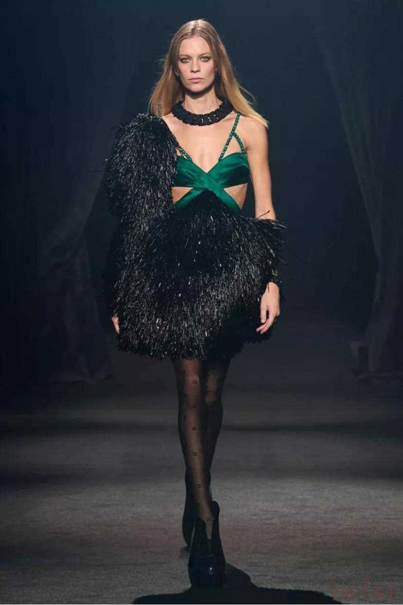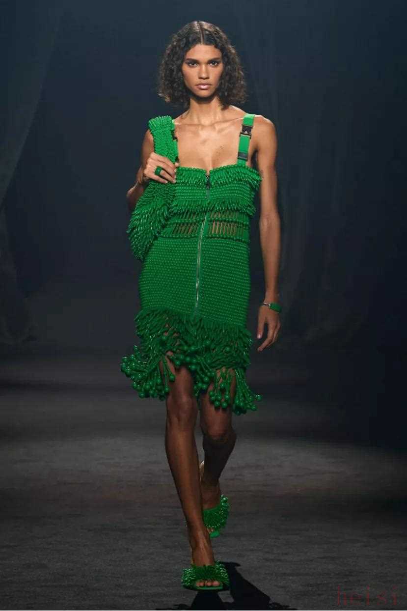 時(shí)下最火的BV綠也被Daniel Lee運(yùn)用到裙子上,串珠致敬的是Lanvin 2007春夏系列的黑色雞尾酒裙。