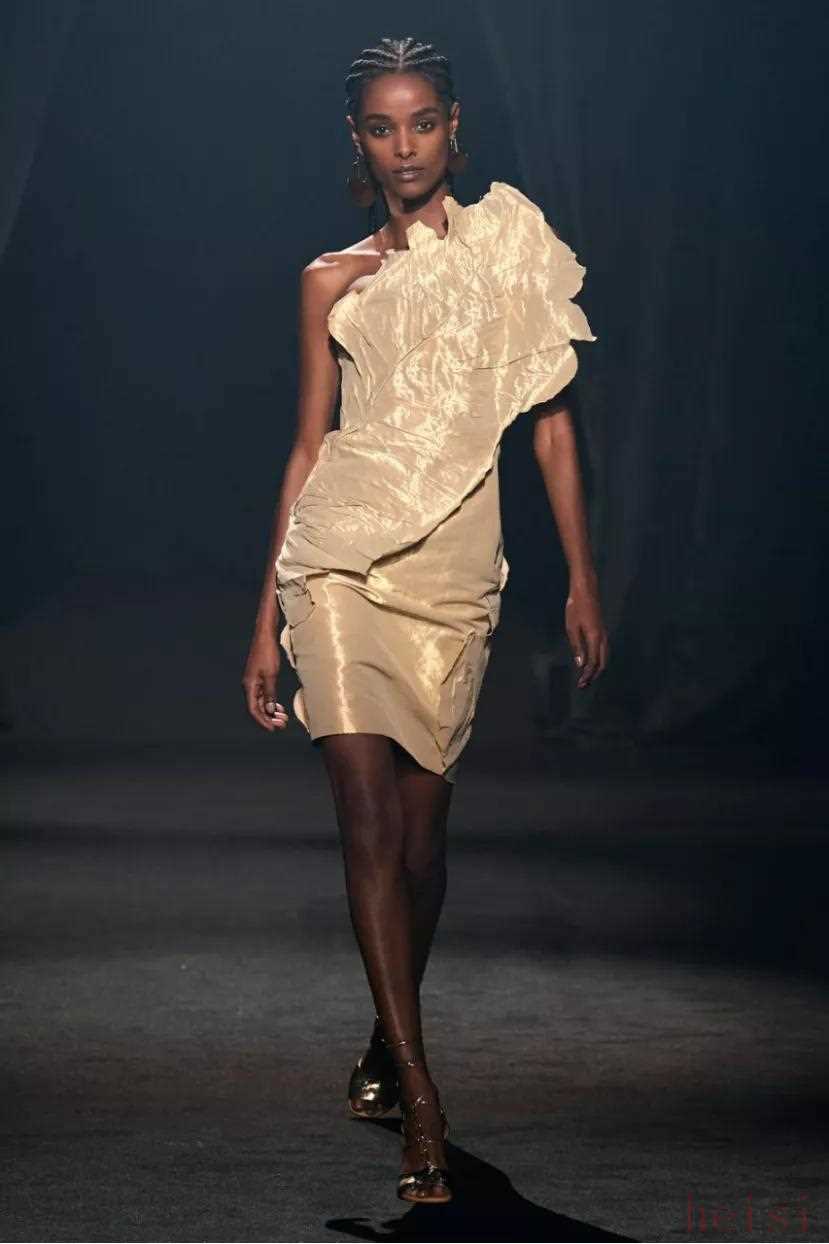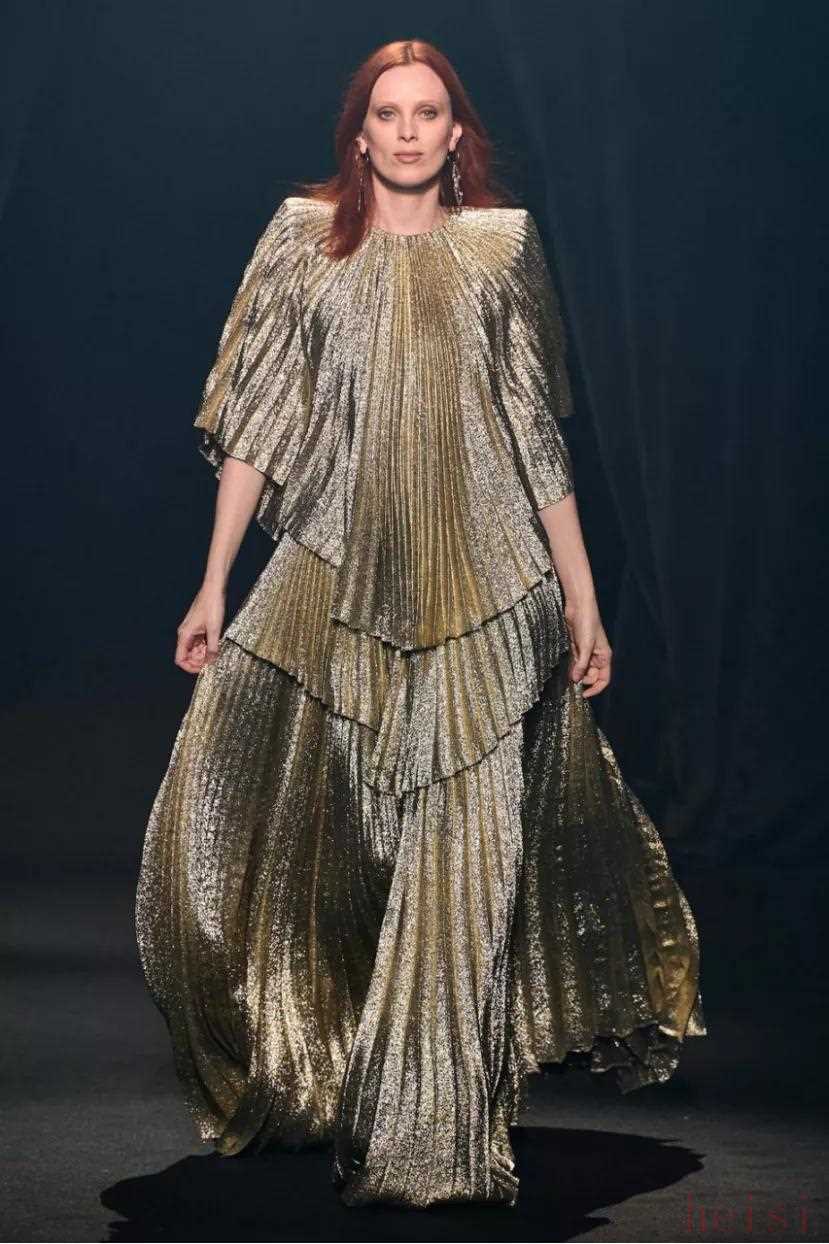 Kim Jones打造了一條香檳金色的雞尾酒裙,大面積褶皺設(shè)計(jì)也是Alber昔日愛用的風(fēng)格。