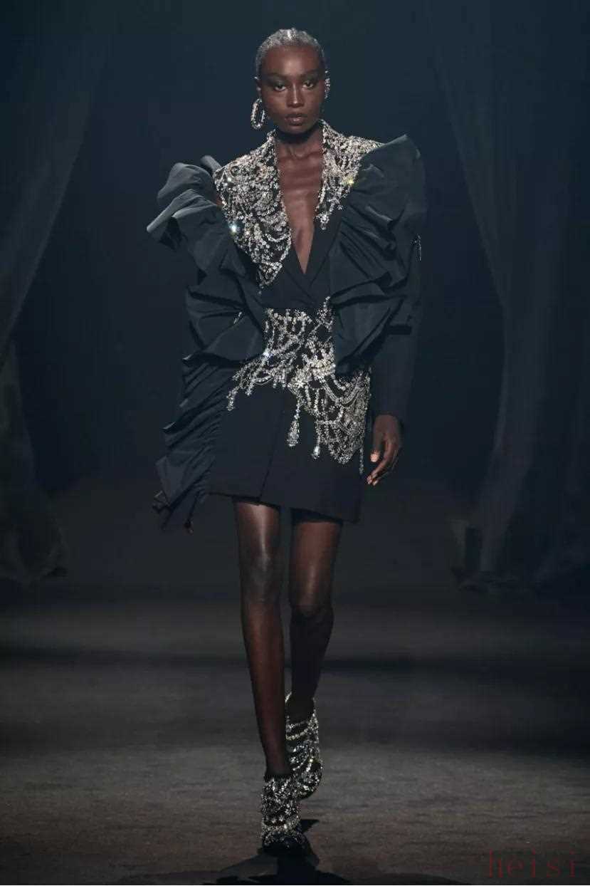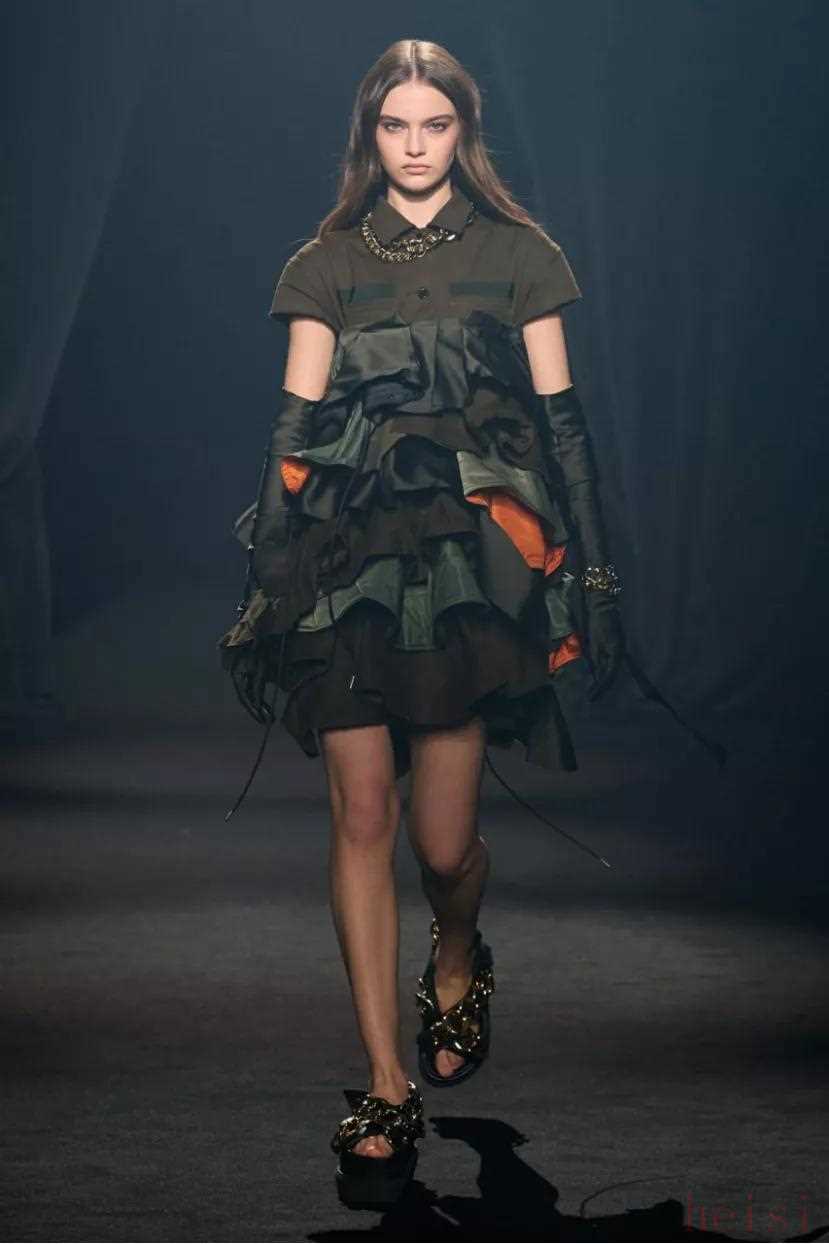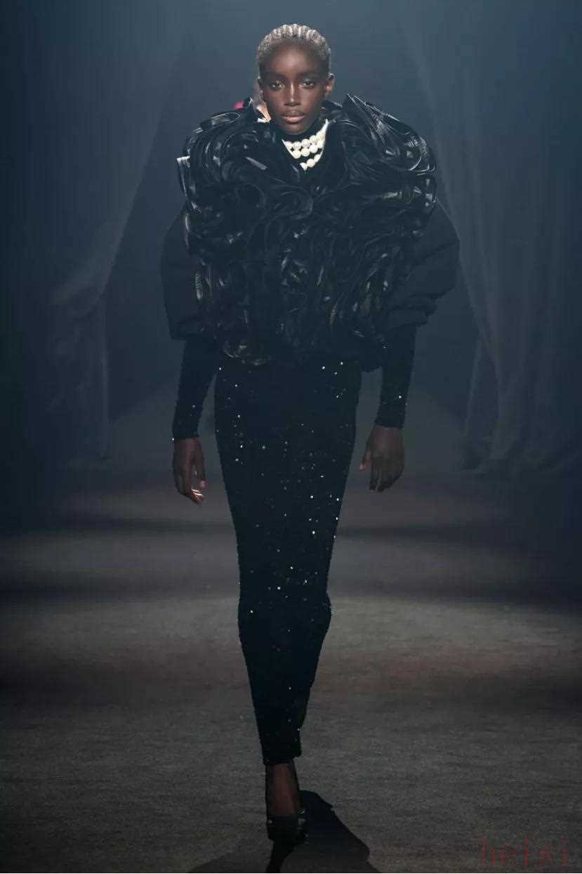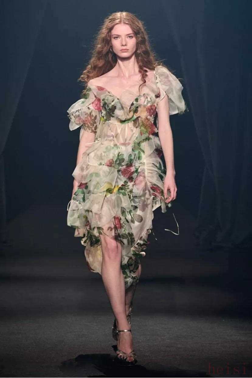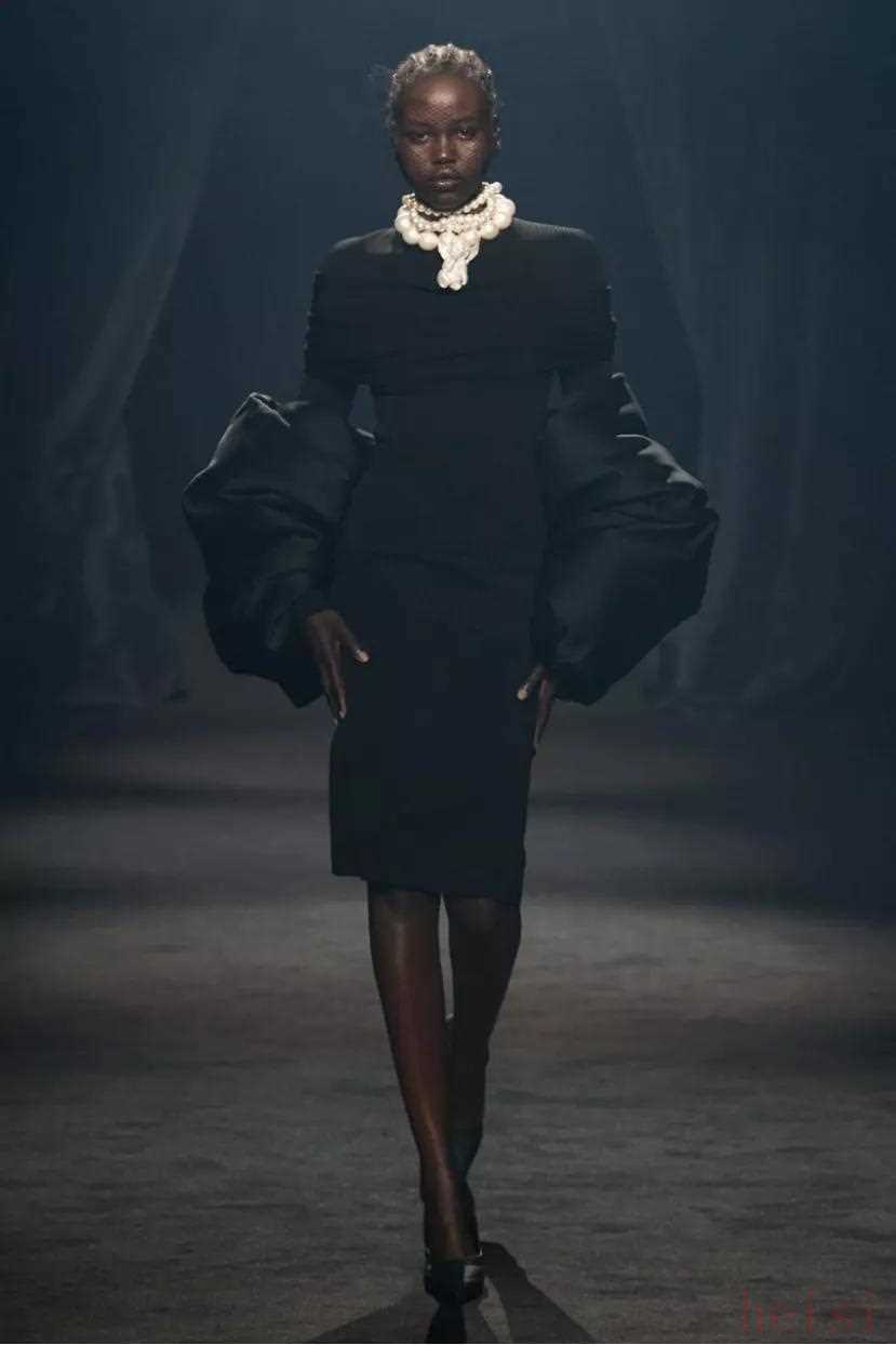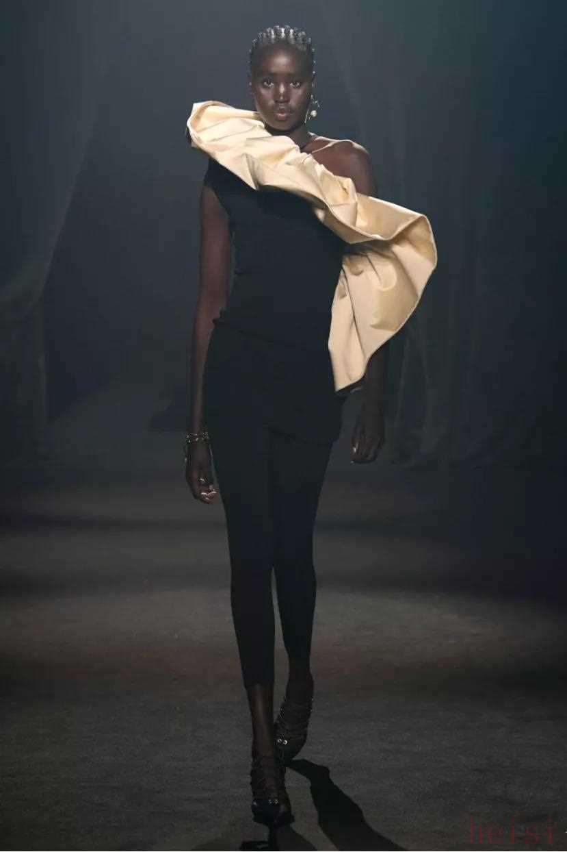 ALEXANDER MCQUEEN 的黑色小禮服兩側(cè)運(yùn)用了超大荷葉邊,這也是Alber設(shè)計(jì)的特色。