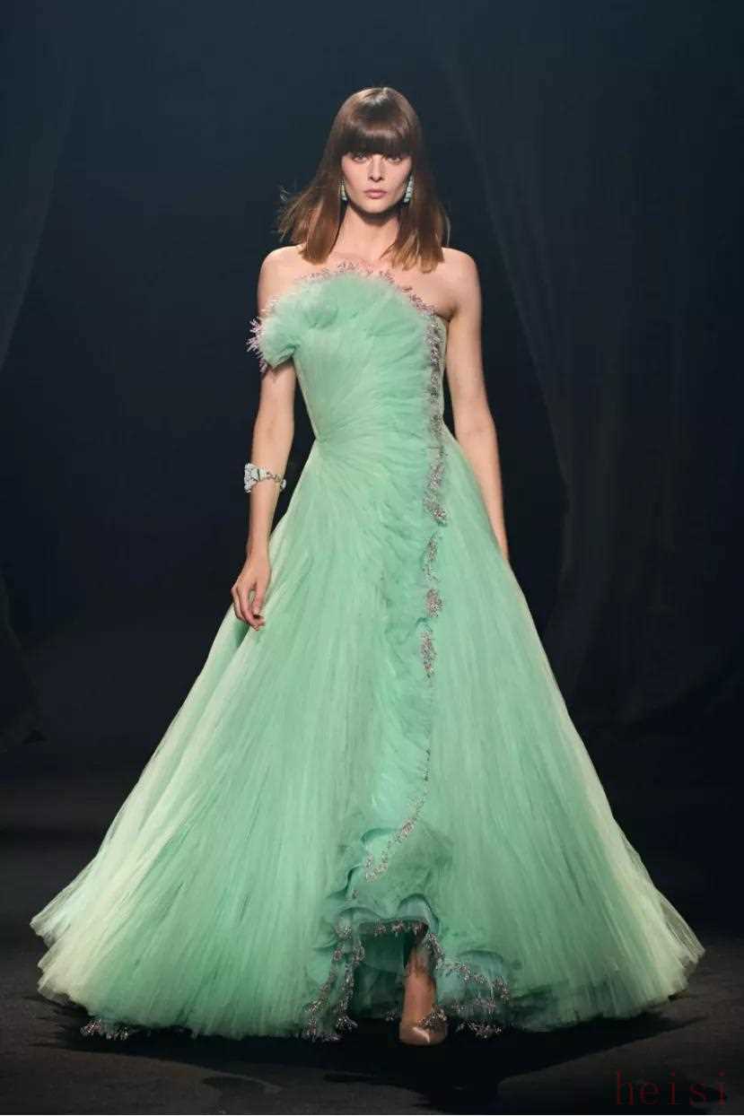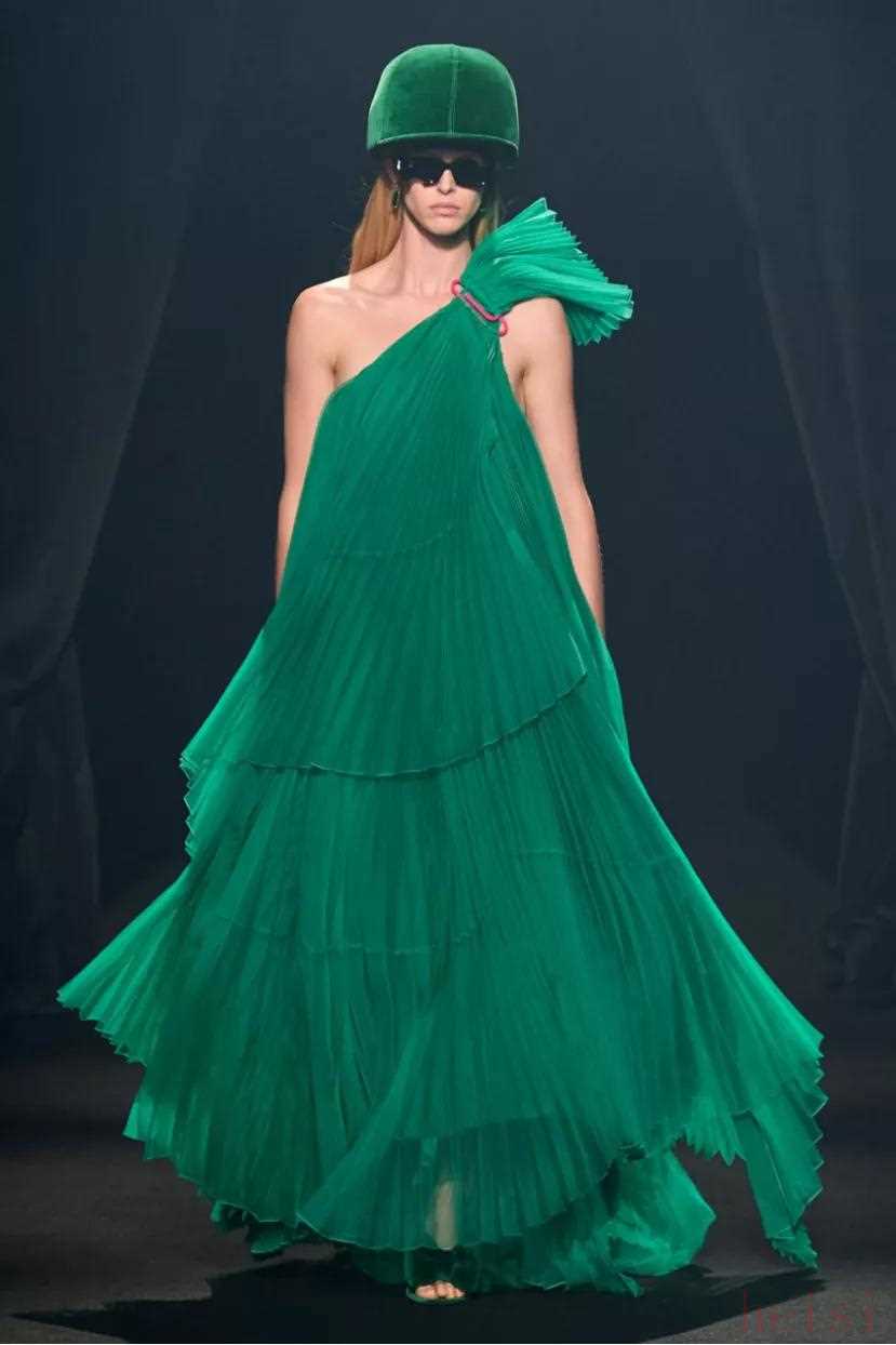 Armani老爺子設(shè)計(jì)的玉石綠禮服中,運(yùn)用了Alber鐘愛的荷葉邊。