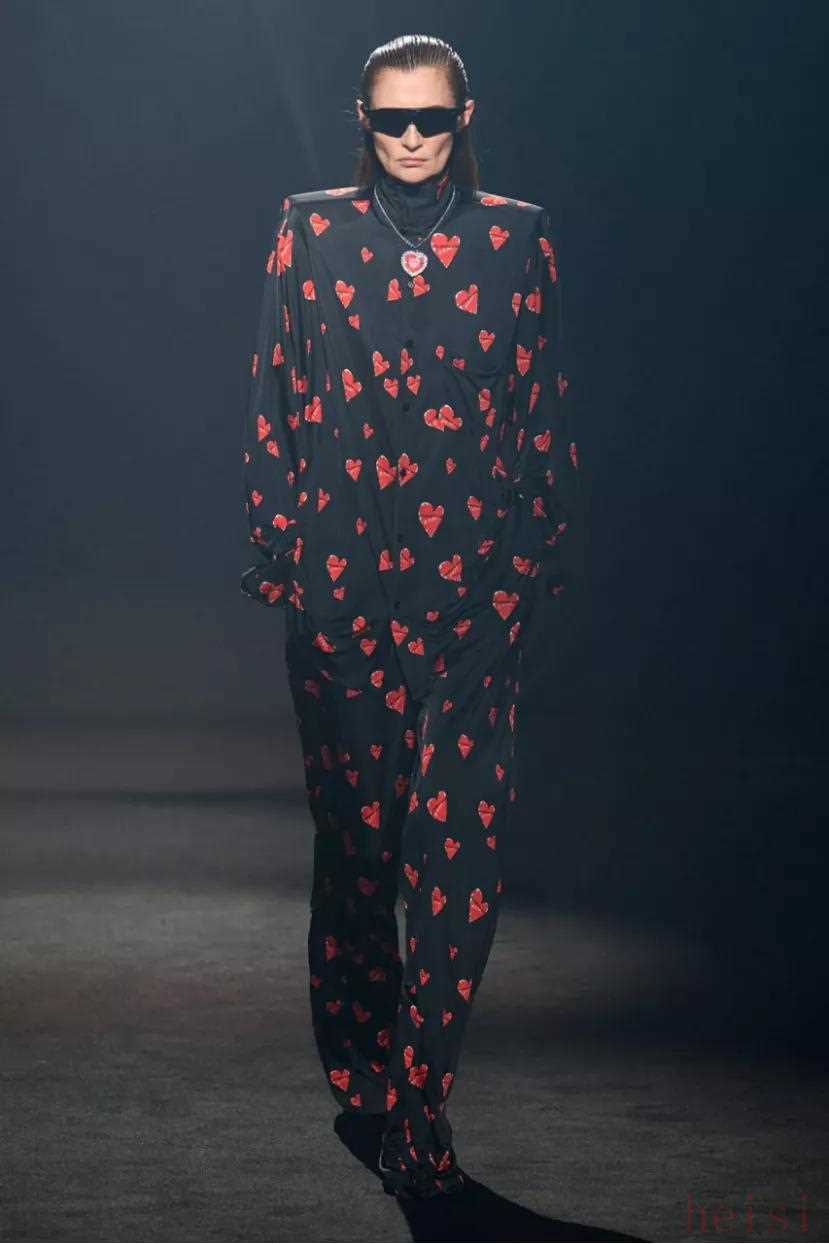 VETEMENTS的寬肩套裝上散落著翻滾的心形印花
