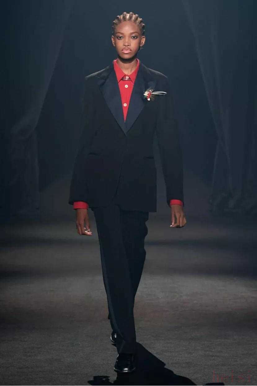 Dries Van Noten把Alber的自畫像印在鮮紅色外套的一側(cè),另一側(cè)用了Alber曾在Lanvin雞尾酒裙上使用過的羊腿袖。
