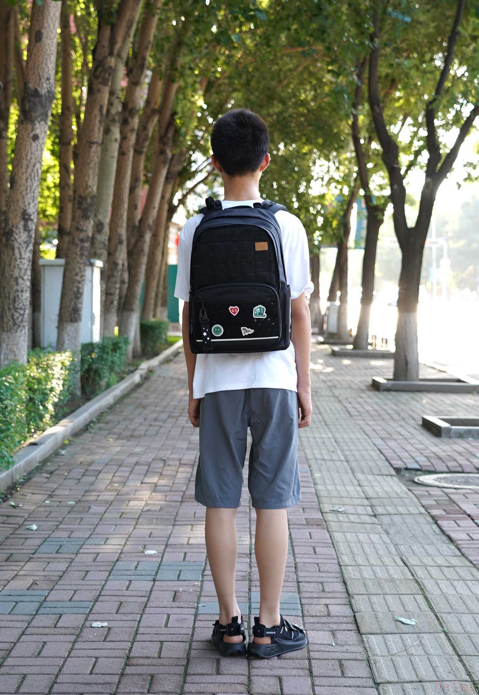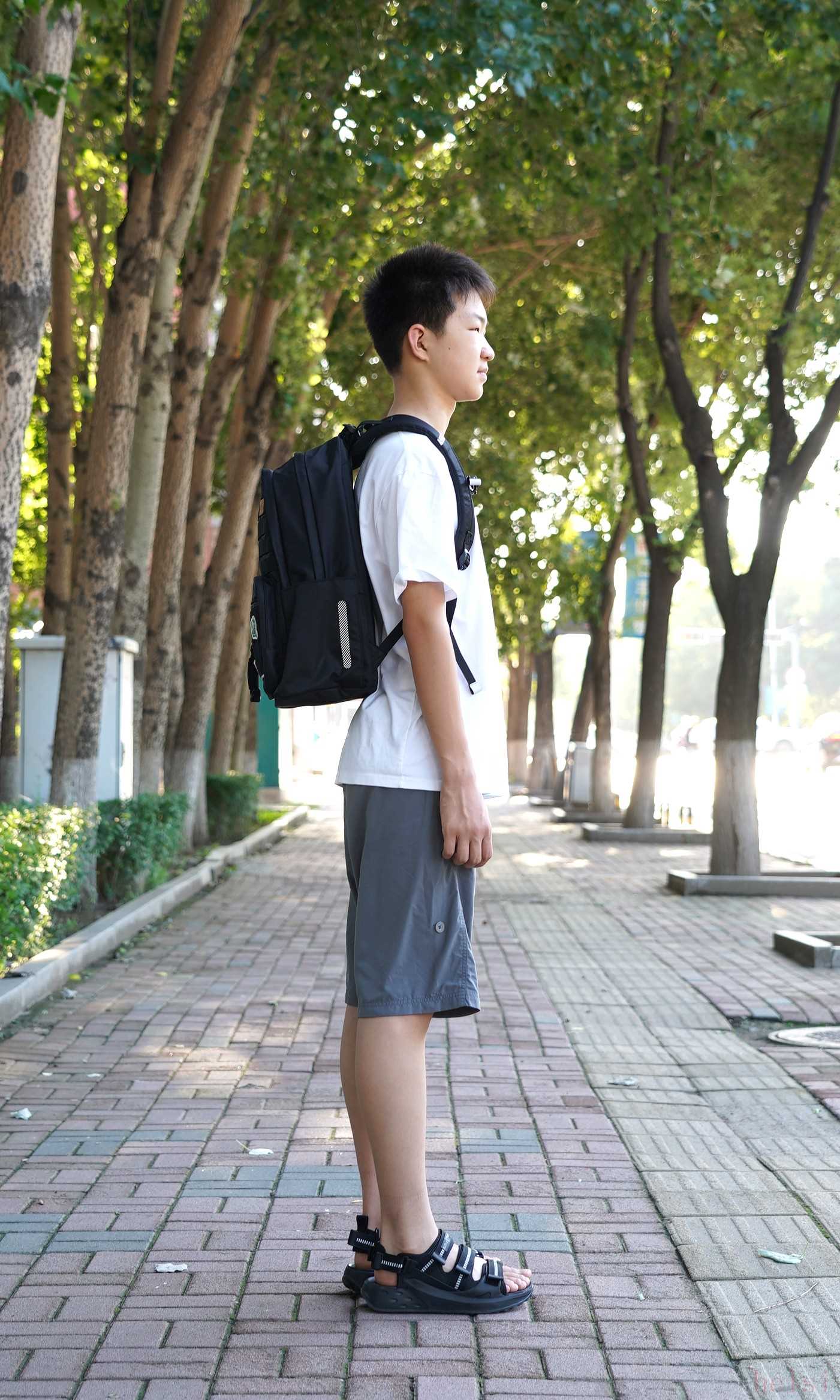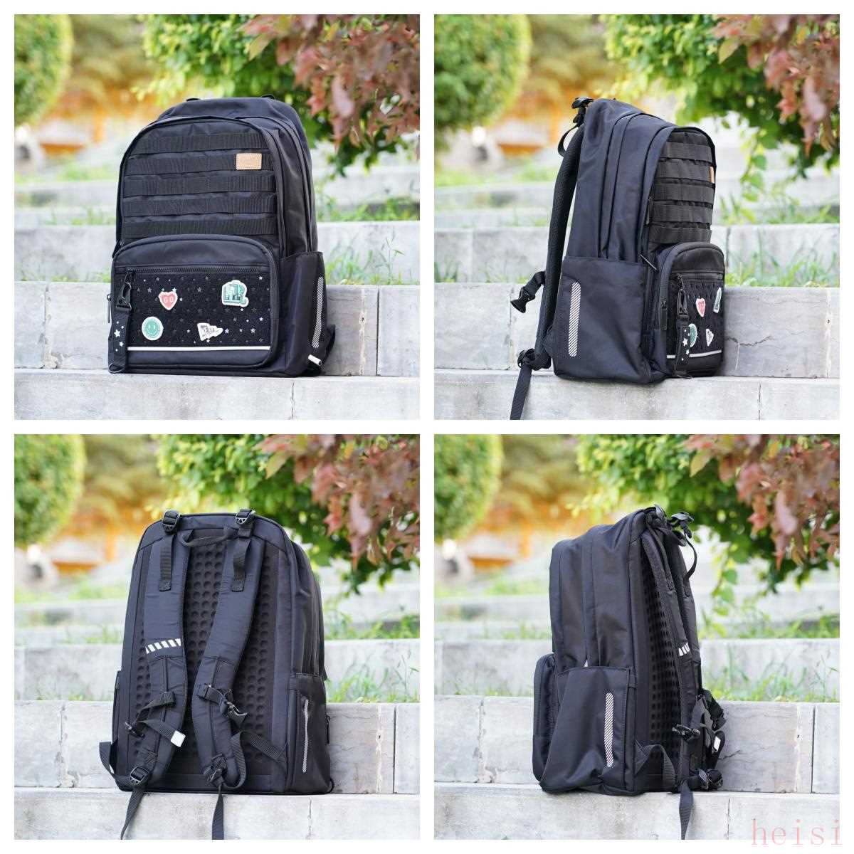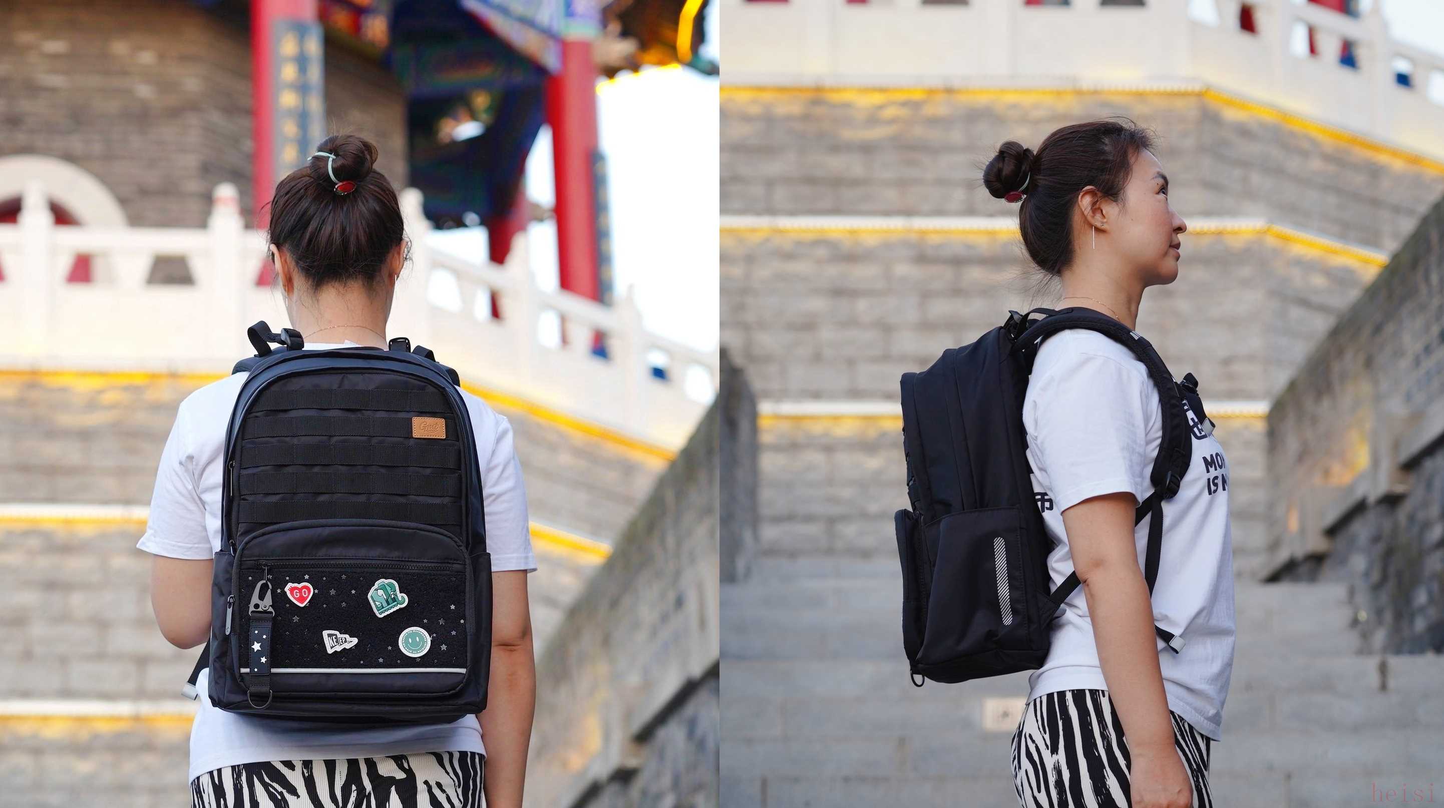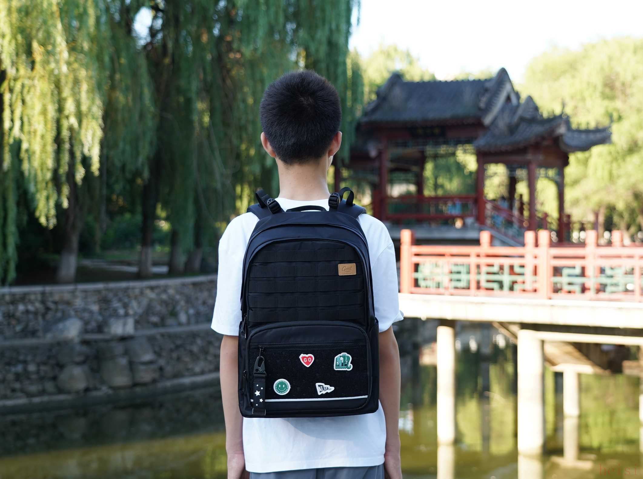 書包形狀偏瘦長,比較適合還在生長發(fā)育期中學生們的身材。整體結構和視覺效果,一看就比小孩書包成熟,也不像大人通勤雙肩電腦包那么“社畜”。如我家買的黑色款,線條明快,不同材質的運用,黑得有層次,看著并不壓抑。