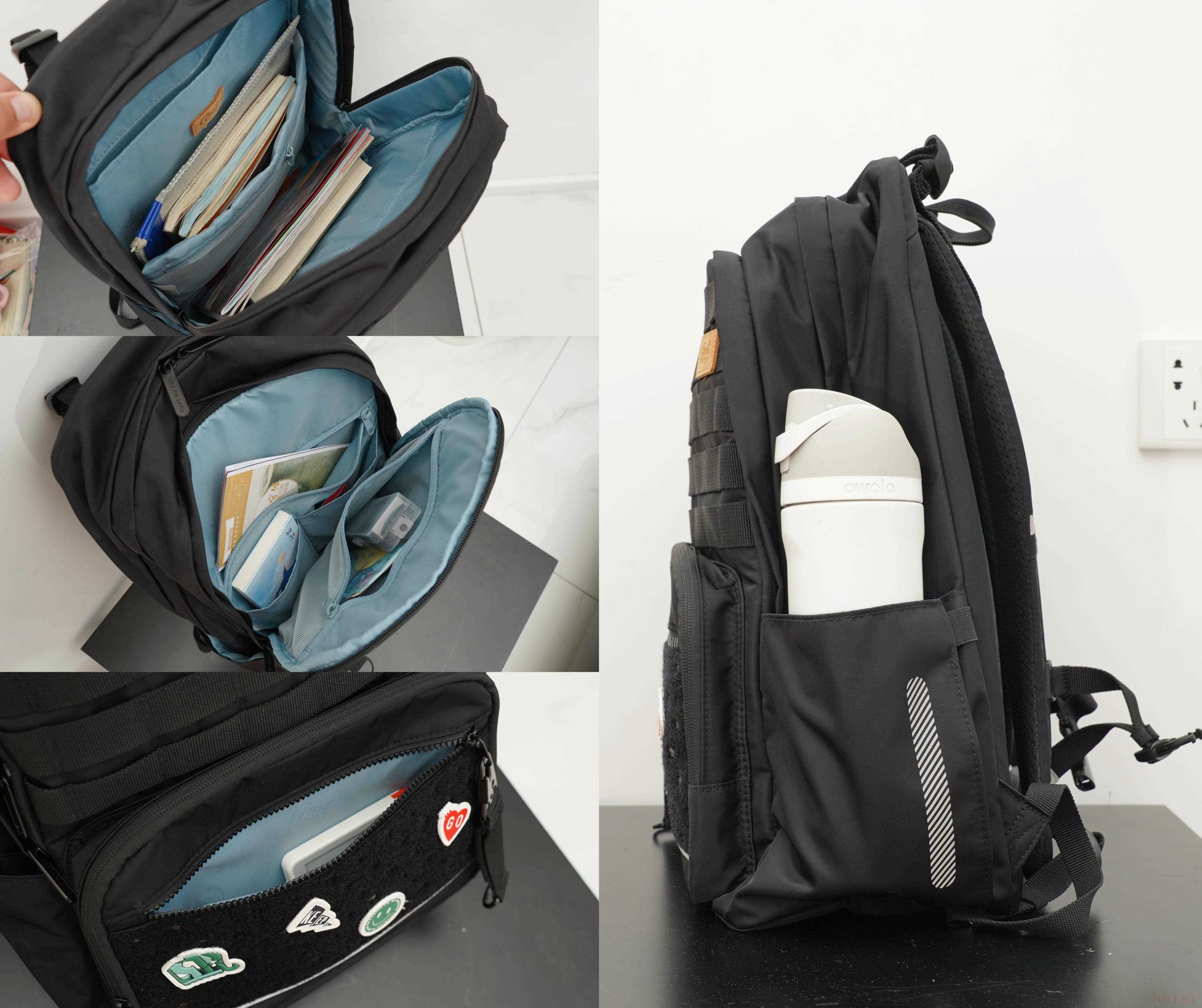 有前隔層拉鏈袋和主拉鏈袋2大主空間,還有前端2個口袋,以及左右兩側的口袋??傮w空間挺大,然后各種小暗格、拉鏈袋不少,即便是學業(yè)加重的中學階段,也應付得來。