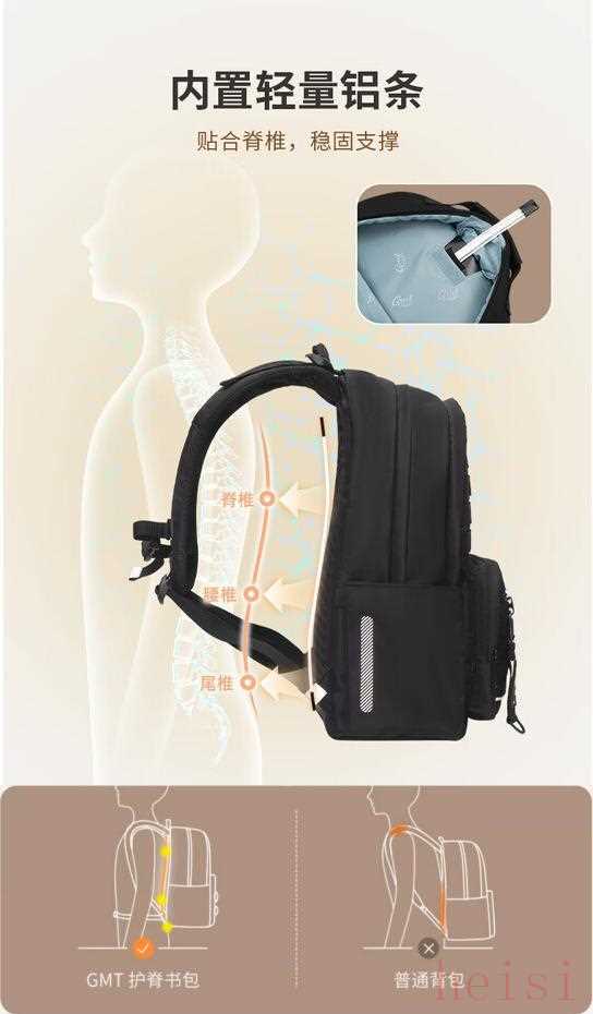 這根S形鋁條,在追求最大限度輕量化的前提下,在護脊方面發(fā)揮了重要作用。S形鋁條,能讓書包更好的貼合孩子們脊柱的S形生理曲線。不會有背著一塊“硬板板”,支楞不貼合的情況。