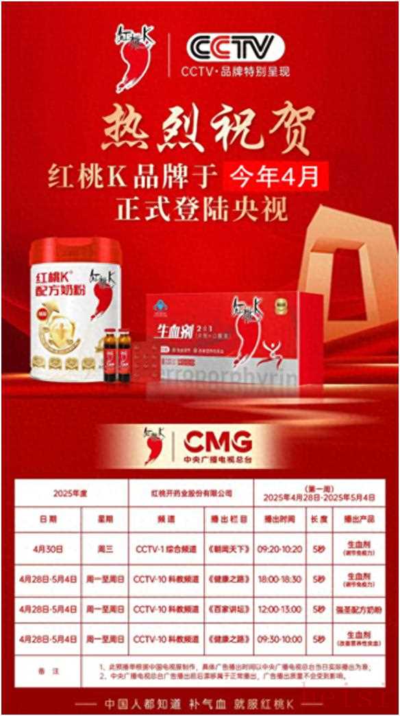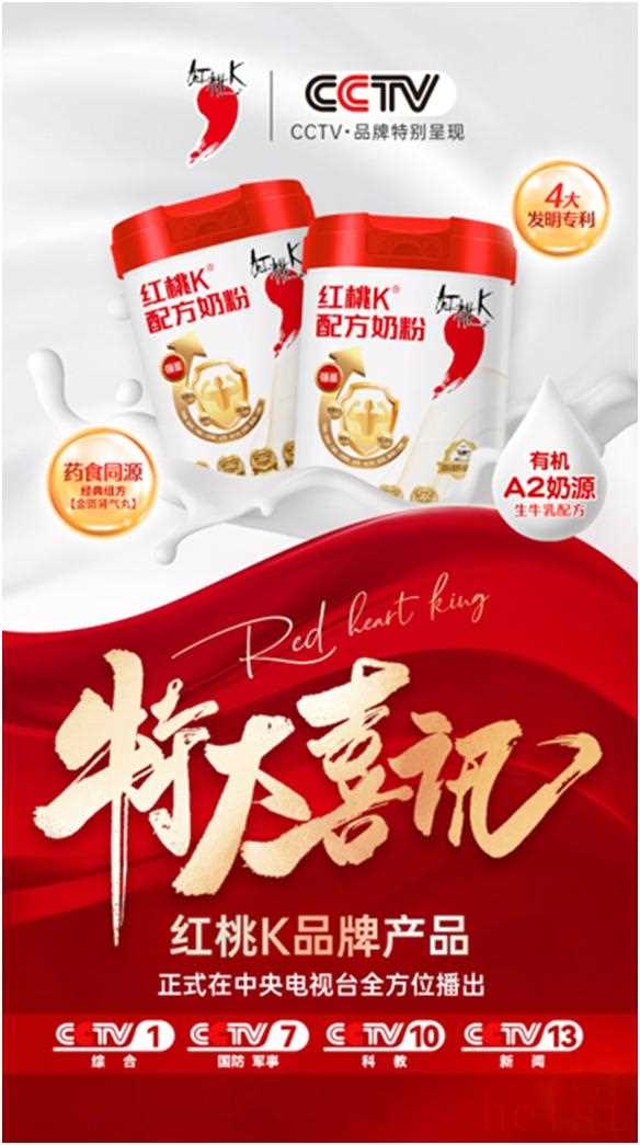據(jù)了解,中國首款紅桃K品牌系列功效型配方奶粉歷經(jīng)層層審查,于2025年4月28日正式登陸中國中央電視臺!紅桃K品牌系列功效型配方奶粉在CCTV-1綜合頻道、CCTV-10科教頻道火熱播出(后期CCTV-7、CCTV13 同步播出)!紅桃K品牌系列奶粉系藥食同源奶粉,科學(xué)配方,精細(xì)化膳食管理,呵護(hù)全家人健康!