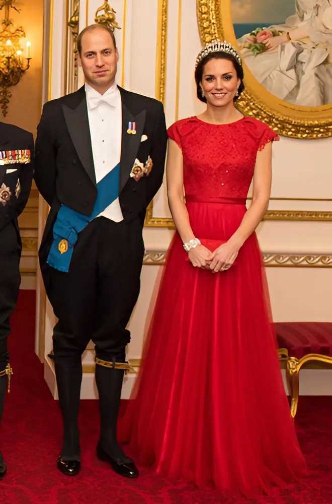 她所穿的珍妮?帕克漢姆品牌的那件令人驚艷的紅色連衣裙,首次亮相是在 2015 年 10 月的一場(chǎng)重要的國(guó)宴上,凱特穿著它著實(shí)令人矚目。當(dāng)時(shí),她搭配了精美的 “蓮花” 頭飾,整套造型盡顯皇家風(fēng)范。
