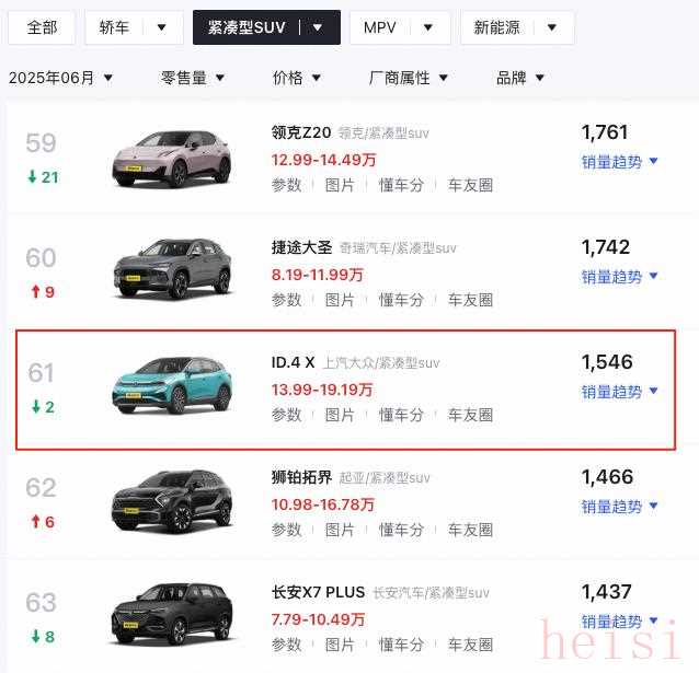 上汽大眾ID.4 X定位于純電緊湊型SUV,與一汽-大眾ID.4 CROZZ屬于姊妹車關(guān)系。同時(shí),在純電緊湊型SUV市場,同級車型還包括起亞EV5(指導(dǎo)價(jià)格區(qū)間為14.98萬-25.58萬元)、極氪ZEEKR X(指導(dǎo)價(jià)格區(qū)間為14.90萬-19.90萬元)、大眾安徽與眾06(指導(dǎo)價(jià)格區(qū)間為18.99萬-24.99萬元)等。根據(jù)銷量數(shù)據(jù)來看,2025年6月,上汽大眾ID.4 X銷量為1546輛。關(guān)于上汽大眾品牌的更多消息,懂車帝將持續(xù)關(guān)注。