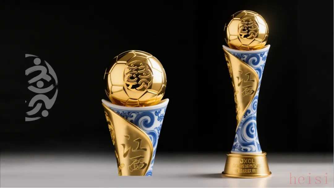 賽事杯由“足球”“青花瓷”“江西”字樣三大元素構(gòu)成,頂部金色足球,呼應(yīng)主題,象征賽事核心與對足球的純粹熱愛,金色賦予榮耀感,詮釋對冠軍榮譽的追求;主體采用江西代表性符號青花瓷,藍白紋飾展現(xiàn)千年陶瓷文化底蘊,溫潤瓷質(zhì)傳遞江西文化細膩厚重,讓獎杯成為江西文化“流動名片”;中部金色飾帶的“江西”書法字體,以傳統(tǒng)筆墨強化地域?qū)傩?,彰顯本土根基,傳遞賽事地域歸屬。