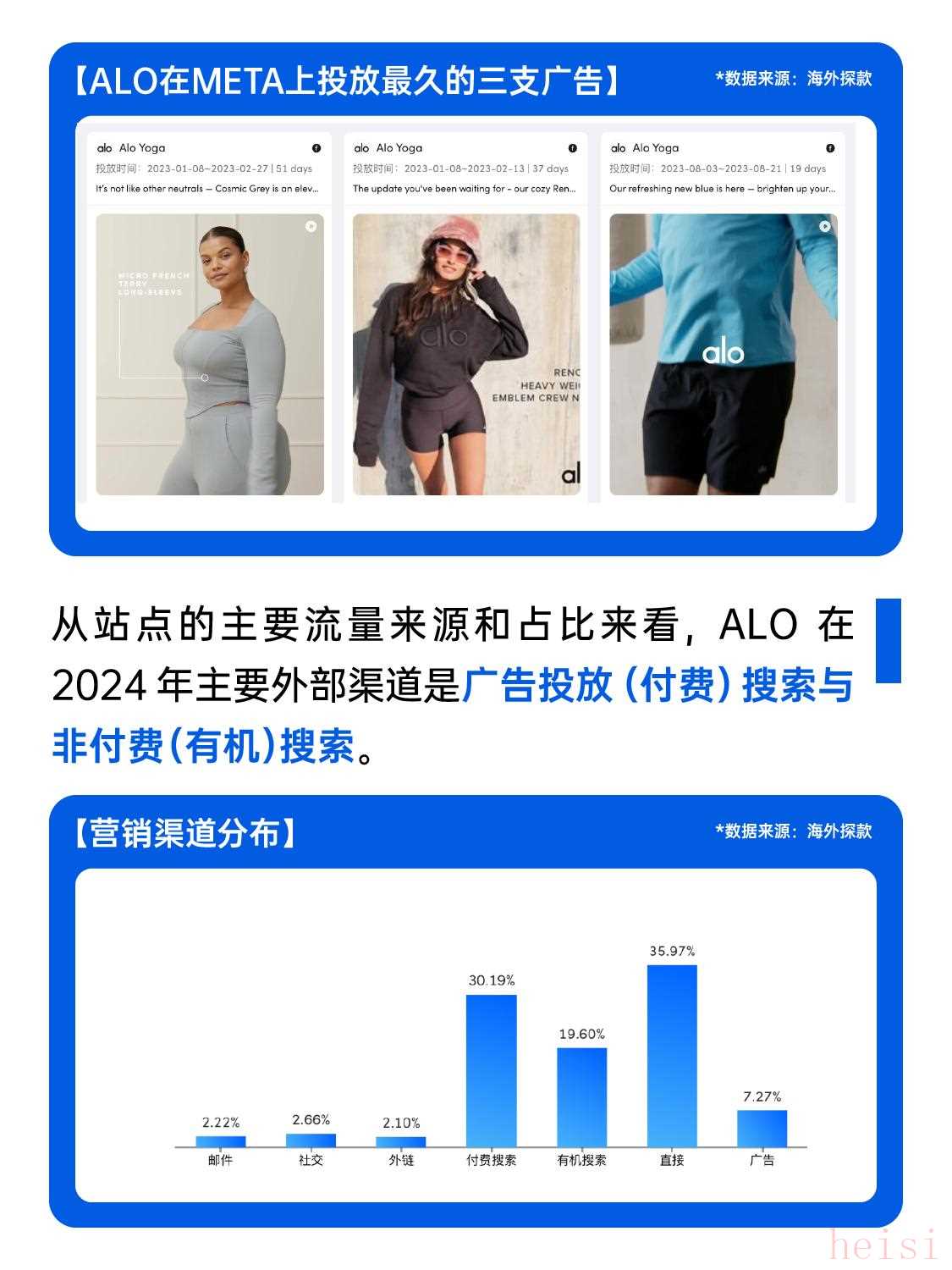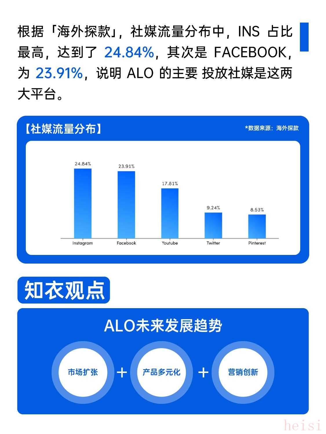 4?? 投放策略:Alo的主要投放的社媒是INS與Facebook,流量占比分別為24.84%與23.91%。