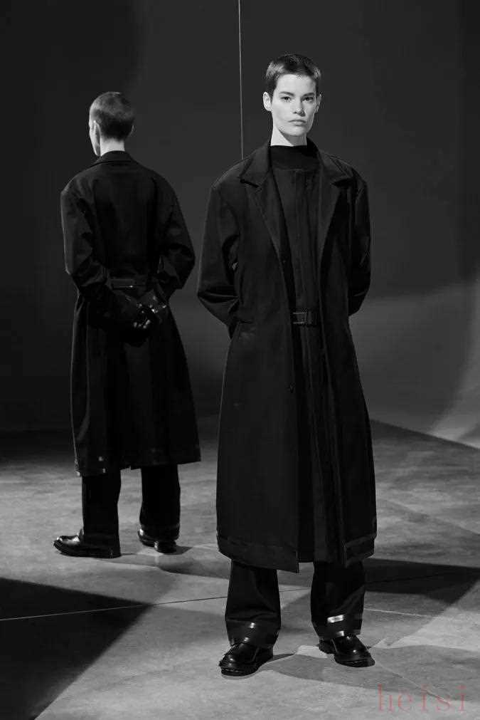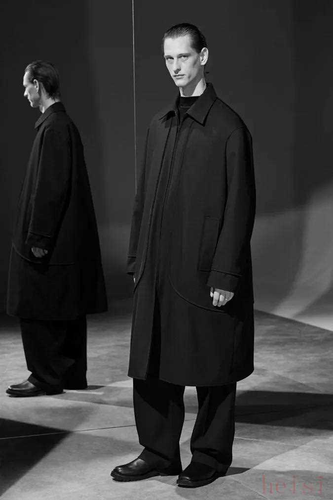 雖然單排扣 Mac Coat 沒有太多的細(xì)節(jié)結(jié)構(gòu),但它的布料有著“不散布”的特點(diǎn),加上它的直筒廓形,經(jīng)過剪裁之后,顯現(xiàn)出鋒利而又筆挺的線條,也因?yàn)椴淮嬖诙嘤嗟募?xì)碎結(jié)構(gòu),整體看起來十分簡潔有力,非常迷人。