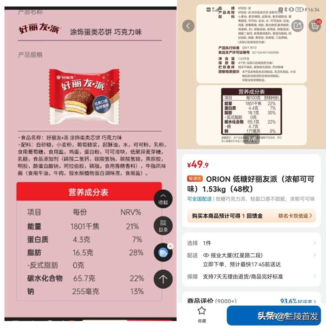 圖片來源:瀟湘晨報(bào)事實(shí)上,山姆超市提供的這款好麗友·派確實(shí)屬于“專供”。不同于市面上常規(guī)的好麗友·派,山姆的這款名為“低糖好麗友派(濃郁可可味)”,強(qiáng)調(diào)低糖和加濃可可兩個(gè)元素——減糖80%、增加30%可可成分、0反式脂肪,包裝盒上的這三組數(shù)據(jù),也符合該超市“嚴(yán)選零食”的一貫定位。對(duì)比“專供款”與市面上的常規(guī)“經(jīng)典款”,又會(huì)發(fā)現(xiàn)其獨(dú)特性沒那么鮮明。“經(jīng)典款”中,配料表排第一位的是白砂糖,隨后依次是小麥粉、葡萄糖、起酥油、水、可可粉等等。注冊(cè)營(yíng)養(yǎng)師李園園告訴《每日經(jīng)濟(jì)新聞》記者,產(chǎn)品所含成分按由高到低依次排列,是配料表的大原則。也就是說,排在越前面,所含成分越高。