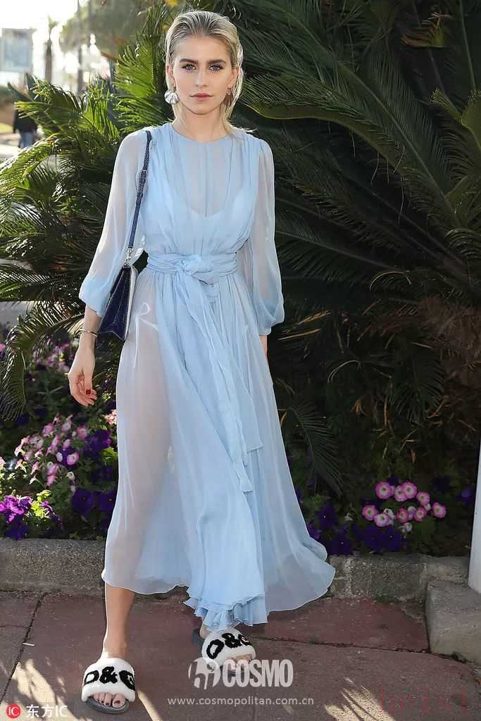 輕盈的羽毛拖鞋和飄逸的雪紡連衣裙,輕松化解一身同色系帶來的膩味。將全黑look從沉悶中解救出來,增添了活潑氣。