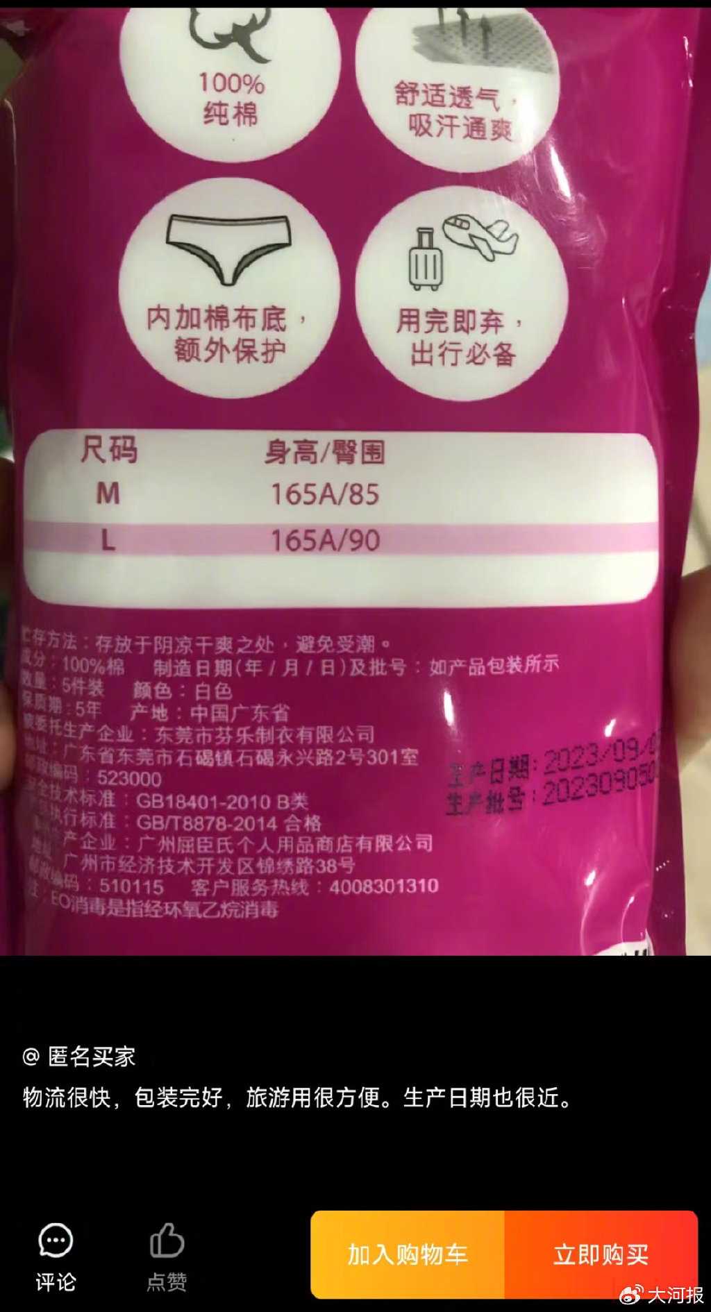 據(jù)某電商平臺上的屈臣氏官方旗艦店顯示,一款名為“屈臣氏舒適免洗棉內(nèi)褲一次性內(nèi)褲”的商品中的女裝包裝,與郭曉婷曬出的商品圖片一致,該款商品單價(jià)28.9元。上述產(chǎn)品介紹稱,商品材質(zhì)為100%棉,采用EO滅菌工藝,使用方式為免洗免曬,開袋即穿。
