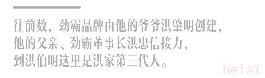 企業(yè)路程的明暗錯落,都壓在了洪伯明的肩頭,1990年出生的他,要迅速成長為符合企業(yè)用人需求與層級制度的管理者,更要迅速為勁霸品牌找到一個符合當下基調的核心產品力。外界總會為接班人故事添上許多戲劇色彩,比如說,一個不學無術的紈绔子弟,或者一個張揚霸道的金主形象??稍诤椴鬟@里,自小對商道耳濡目染的他,承接更多的是權衡二字。
