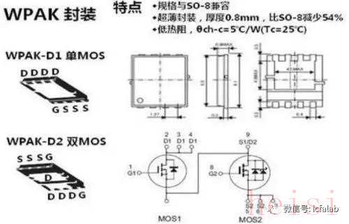 瑞薩WPAK封裝尺寸 LFPAK和LFPAK-I是瑞薩開發(fā)的另外2種與SO-8兼容的小形封裝。LFPAK類似D-PAK,但比D-PAK體積小。LFPAK-i是將散熱板向上,通過散熱片散熱。