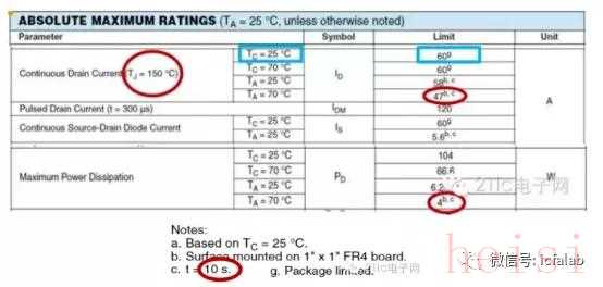 圖1 RDS(on)在最高工作溫度的30%~150%這個范圍內隨溫度增加而增加 導通電阻對N溝道和P溝道MOSFET都是十分重要的。在開關電源中,Qg是用在開關電源里的N溝道MOSFET的關鍵選擇標準,因為Qg會影響開關損耗。這些損耗有兩個方面影響:一個是影響MOSFET導通和關閉的轉換時間;另一個是每次開關過程中對柵極電容充電所需的能量。要牢記的一點是,Qg取決于柵源電壓,即使用更低的Vgs可以減少開關損耗。 作為一種快速比較準備用在開關應用里MOSFET的方式,設計者經(jīng)常使用一個單數(shù)公式,公式包括表示傳導損耗RDS(on)及表示開關損耗的Qg:RDS(on) xQg。這個“優(yōu)值系數(shù)”(FOM)總結了器件的性能,可以用典型值或最大值來比較MOSFET。要保證在器件中進行準確的比較,你需要確定用于RDS(on) 和Qg的是相同的VGS,在公示里典型值和最大值沒有碰巧混在一起。較低的FOM能讓你在開關應用里獲得更好的性能,但是不能保證這一點。只有在實際的電路里才能獲得最好的比較結果,在某些情況下可能需要針對每個MOSFET對電路進行微調。 額定電流和功率耗散 基于不同的測試條件,大多數(shù)MOSFET在數(shù)據(jù)表里都有一個或多個的連續(xù)漏極電流。你要仔細看看數(shù)據(jù)表,搞清楚這個額定值是在指定的外殼溫度下(比如TC = 25℃),或是環(huán)境溫度(比如TA = 25℃)。這些數(shù)值當中哪些是最相關將取決于器件的特性和應用(見圖2)。
