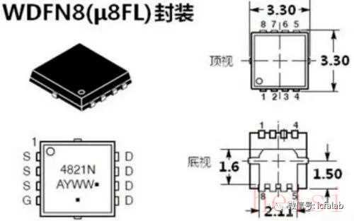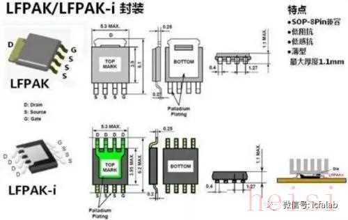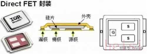 安森美WDFN8封裝 4、恩智浦(NXP)LFPAK和QLPAK封裝 恩智浦(原Philps)對SO-8封裝技術改進為LFPAK和QLPAK。其中LFPAK被認為是世界上高度可靠的功率SO-8封裝;而QLPAK具有體積小、散熱效率更高的特點,與普通SO-8相比,QLPAK占用PCB板的面積為6*5mm,同時熱阻為1.5k/W。 恩智浦LFPAK封裝 恩智浦QLPAK封裝 5、意法(ST)半導體PowerSO-8封裝 意法半導體功率MOSFET芯片封裝技術有SO-8、PowerSO-8、PowerFLAT、DirectFET、PolarPAK等,其中PowerSO-8正是SO-8的改進版,此外還有PowerSO-10、PowerSO-20、TO-220FP、H2PAK-2等封裝。 意法半導體Power SO-8封裝 6、飛兆(Fairchild)半導體Power 56封裝Power 56是Farichild的專用稱呼,正式名稱為DFN 5×6。其封裝面積跟常用的TSOP-8不相上下,而薄型封裝又節(jié)約元件凈空高度,底部Thermal-Pad設計降低了熱阻,因此很多功率器件廠商都部署了DFN 5×6。 Fairchild Power 56封裝 7、國際整流器(IR)Direct FET封裝 Direct FET能在SO-8或更小占位面積上,提供高效的上部散熱,適用于計算機、筆記本電腦、電信和消費電子設備的AC-DC及DC-DC功率轉換應用。與標準塑料分立封裝相比,DirectFET的金屬罐構造具有雙面散熱功能,因而可有效將高頻DC-DC降壓式轉換器的電流處理能力增加一倍。 Direct FET封裝屬于反裝型,漏極(D)的散熱板朝上,并覆蓋金屬外殼,通過金屬外殼散熱。Direct FET封裝極大地改善了散熱,并且占用空間更小,散熱良好。