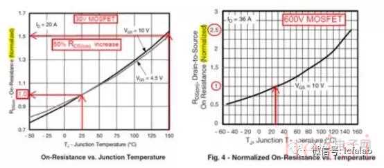 威世Power-PAK技術 威世的Power-PAK、法意半導體的Power SO-8、安美森半導體的SO-8 Flat Lead、瑞薩的WPAK/LFPAK、飛兆半導體的Power 56和Bottomless Package都采用了此散熱技術。 3、改變散熱的熱傳導方向 Power-PAK的封裝雖然顯著減小了芯片到PCB的熱阻,但當電流需求繼續(xù)增大時,PCB同時會出現(xiàn)熱飽和現(xiàn)象。所以散熱技術的進一步改進就是改變散熱方向,讓芯片的熱量傳導到散熱器而不是PCB。 瑞薩LFPAK-i封裝 瑞薩的LFPAK-I封裝、國際整流器的Direct FET封裝均是這種散熱技術的典型代表。 總結 未來,隨著電子制造業(yè)繼續(xù)朝著超薄、小型化、低電壓、大電流方向的發(fā)展,MOS管的外形及內部封裝結構也會隨之改變,以更好適應制造業(yè)的發(fā)展需求。另外,為降低電子制造商的選用門檻,MOS管向模塊化、系統(tǒng)級封裝方向發(fā)展的趨勢也將越來越明顯,產(chǎn)品將從性能、成本等多維度協(xié)調發(fā)展。 而封裝作為MOS管選型的重要參考因素之一,不同的電子產(chǎn)品有不同的電性要求,不同的安裝環(huán)境也需要匹配的尺寸規(guī)格來滿足。實際選用中,應在大原則下,根據(jù)實際需求情況來做抉擇。 有些電子系統(tǒng)受制于PCB的尺寸和內部的高度,如通信系統(tǒng)的模塊電源由于高度的限制通常采用DFN5*6、DFN3*3的封裝;在有些ACDC的電源中,使用超薄設計或由于外殼的限制,適于裝配TO220封裝的功率MOS管,此時引腳可直接插到根部,而不適于使用TO247封裝的產(chǎn)品;也有些超薄設計需要將器件管腳折彎平放,這會加大MOS管選用的復雜度。 如何選取MOSFET 一位工程師曾經(jīng)對我講,他從來不看MOSFET數(shù)據(jù)表的第一頁,因為“實用”的信息只在第二頁以后才出現(xiàn)。事實上,MOSFET數(shù)據(jù)表上的每一頁都包含有對設計者非常有價值的信息。但人們不是總能搞得清楚該如何解讀制造商提供的數(shù)據(jù)。本文概括了一些MOSFET的關鍵指標,這些指標在數(shù)據(jù)表上是如何表述的,以及你理解這些指標所要用到的清晰圖片。像大多數(shù)電子器件一樣,MOSFET也受到工作溫度的影響。所以很重要的一點是了解測試條件,所提到的指標是在這些條件下應用的。還有很關鍵的一點是弄明白你在“產(chǎn)品簡介”里看到的這些指標是“最大”或是“典型”值,因為有些數(shù)據(jù)表并沒有說清楚。 電壓等級 確定MOSFET的首要特性是其漏源電壓VDS,或“漏源擊穿電壓”,這是在柵極短路到源極,漏極電流在250μA情況下,MOSFET所能承受的保證不損壞的最高電壓。VDS也被稱為“25℃下的絕對最高電壓”,但是一定要記住,這個絕對電壓與溫度有關,而且數(shù)據(jù)表里通常有一個“VDS溫度系數(shù)”。你還要明白,最高VDS是直流電壓加上可能在電路里存在的任何電壓尖峰和紋波。例如,如果你在電壓30V并帶有100mV、5ns尖峰的電源里使用30V器件,電壓就會超過器件的絕對最高限值,器件可能會進入雪崩模式。在這種情況下,MOSFET的可靠性沒法得到保證。 在高溫下,溫度系數(shù)會顯著改變擊穿電壓。例如,一些600V電壓等級的N溝道MOSFET的溫度系數(shù)是正的,在接近最高結溫時,溫度系數(shù)會讓這些MOSFET變得象650V MOSFET。很多MOSFET用戶的設計規(guī)則要求10%~20%的降額因子。在一些設計里,考慮到實際的擊穿電壓比25℃下的額定數(shù)值要高5%~10%,會在實際設計中增加相應的有用設計裕量,對設計是很有利的。 對正確選擇MOSFET同樣重要的是理解在導通過程中柵源電壓VGS的作用。這個電壓是在給定的最大RDS(on)條件下,能夠確保MOSFET完全導通的電壓。這就是為什么導通電阻總是與VGS水平關聯(lián)在一起的原因,而且也是只有在這個電壓下才能保證器件導通。一個重要的設計結果是,你不能用比用于達到RDS(on)額定值的最低VGS還要低的電壓,來使MOSFET完全導通。例如,用3.3V微控制器驅動MOSFET完全導通,你需要用在VGS= 2.5V或更低條件下能夠導通的MOSFET。 導通電阻,柵極電荷,以及“優(yōu)值系數(shù)” MOSFET的導通電阻總是在一個或多個柵源電壓條件下確定的。最大RDS(on)限值可以比典型數(shù)值高20%~50%。RDS(on)最大限值通常指的25℃結溫下的數(shù)值,而在更高的溫度下,RDS(on)可以增加30%~150%,如圖1所示。由于RDS(on)隨溫度而變,而且不能保證最小的電阻值,根據(jù)RDS(on)來檢測電流不是很準確的方法。