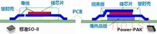 IR Direct FET封裝系列部分產(chǎn)品規(guī)格 內部封裝改進方向 除了外部封裝,基于電子制造對MOS管的需求的變化,內部封裝技術也在不斷得到改進,這主要從三個方面進行:改進封裝內部的互連技術、增加漏極散熱板、改變散熱的熱傳導方向。 1、封裝內部的互連技術 TO、D-PAK、SOT、SOP等采用焊線式的內部互連封裝技術,當CPU或GPU供電發(fā)展到低電壓、大電流時代,焊線式的SO-8封裝就受到了封裝電阻、封裝電感、PN結到PCB和外殼熱阻等因素的限制。 SO-8內部封裝結構 這四種限制對其電學和熱學性能有著極大的影響。隨著電流密度的提高,MOSFET廠商在采用SO-8尺寸規(guī)格時,同步對焊線互連形式進行了改進,用金屬帶、或金屬夾板代替焊線,以降低封裝電阻、電感和熱阻。 標準型SO-8與無導線SO-8封裝對比 國際整流器(IR)的改進技術稱之為Copper Strap;威世(Vishay)稱之為Power Connect技術;飛兆半導體則叫做Wireless Package。新技術采用銅帶取代焊線后,熱阻降低了10-20%,源極至封裝的電阻降低了61%。 國際整流器的Copper Strap技術 威世的Power Connect技術