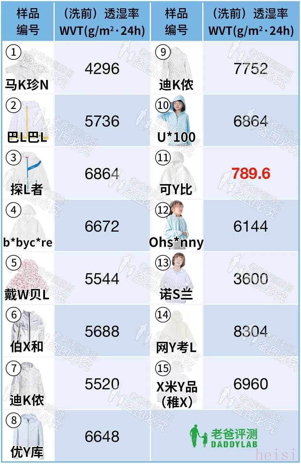 可以看到,11 號樣品的透濕率只有 789.6g/㎡·24h,透濕能力明顯弱。其余 14 款樣品的透濕率均在 3000g/㎡·24h,其中有 8 款透濕率在 6000g/㎡·24h,14 號樣品的透濕率更是高達(dá) 8304g/㎡·24h。