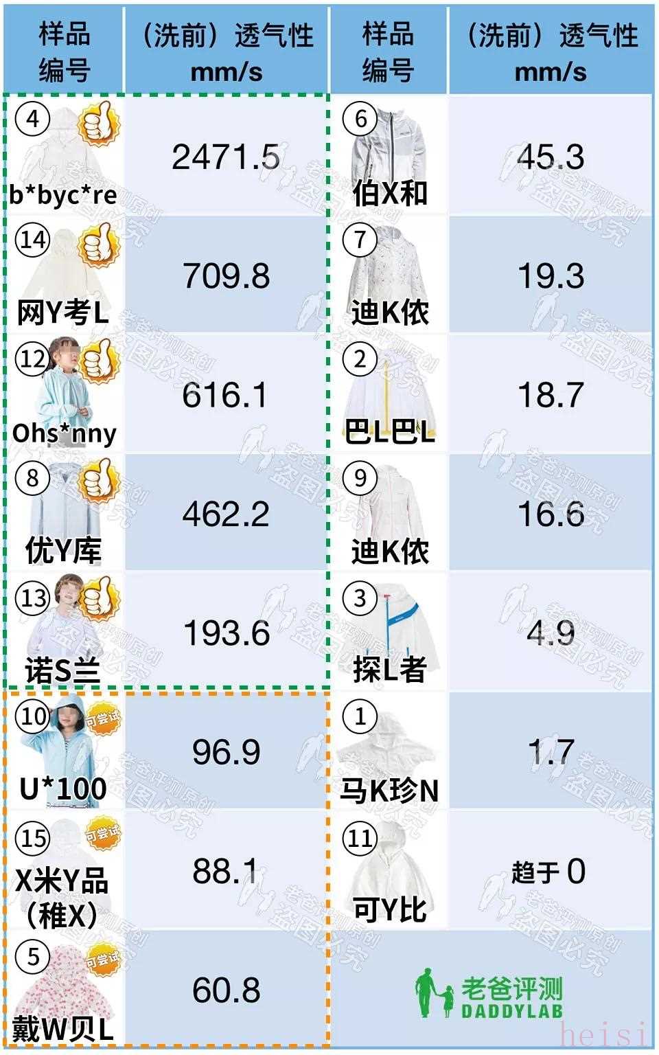 有 5 款防曬衣樣品透氣性較差,在 20mm/s 以下,衣物的基本性能和舒適性能會差些。