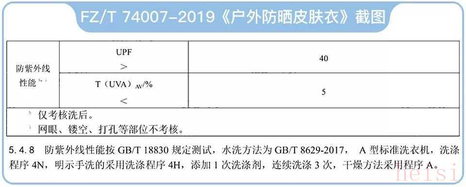 綜合考慮下,我們參照了將于 2019 年 11 月 1 日實(shí)施的 FZ/T 74007-2019《戶外防曬皮膚衣》標(biāo)準(zhǔn)。