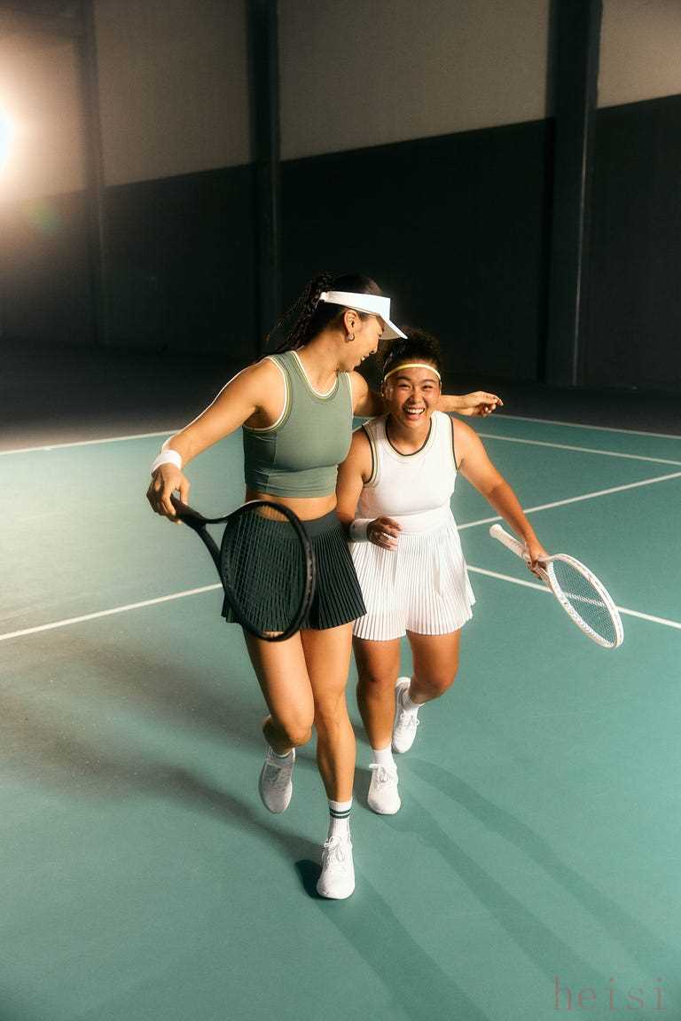 網(wǎng)球愛好者MENGWA穿著Varsity 女士網(wǎng)球低圓領(lǐng)短款運動背心、Varsity 女士風琴褶高腰網(wǎng)球裙