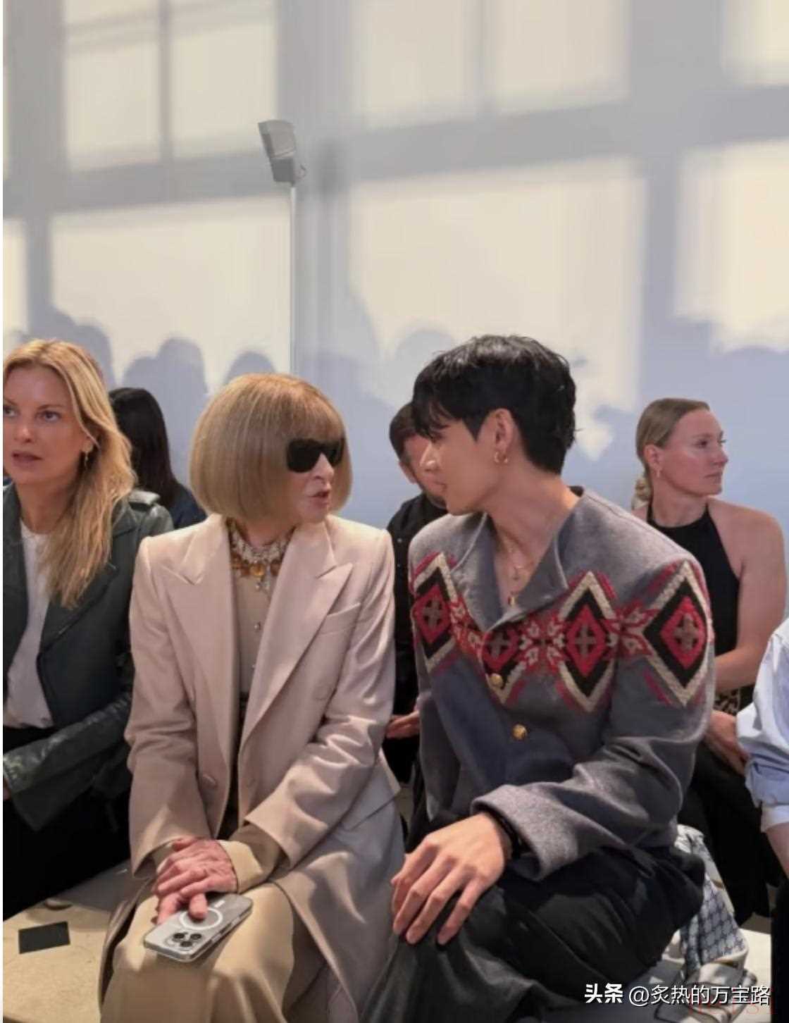 全球時尚界多位核心人物出席本場大秀。Dior男裝創(chuàng)意總監(jiān)Jonathan Anderson在秀場外與V合影,并在個人賬號中發(fā)布合照內(nèi)容。秀場內(nèi),V被安排在正中主賓區(qū),與《Vogue》總編Anna Wintour比鄰而坐。《Vogue》方透露,Anna為V親自留座,并向其發(fā)出《Vogue World》未來活動的雙次。