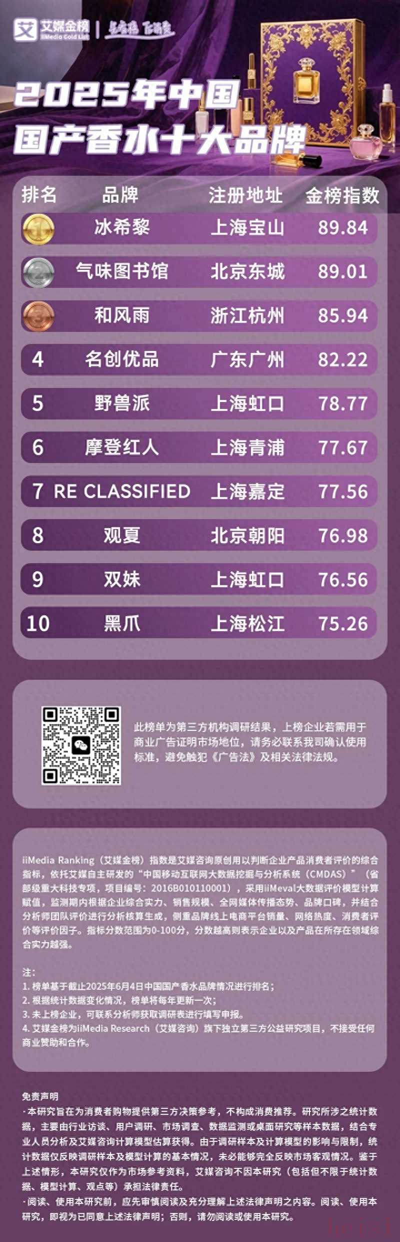 截至我所知的信息,艾媒金榜發(fā)布的《2025年中國國產(chǎn)香水十大品牌》可能尚未公布。艾媒咨詢通常會在每年發(fā)布一系列市場研究報告,包括品牌排名等。
