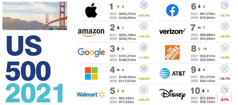 英國(guó)品牌評(píng)估機(jī)構(gòu)“品牌金融”(Brand Finance)發(fā)布“2021美國(guó)最有價(jià)值的500大品牌”排行榜(US 500 2021)。蘋果升至第一位,亞馬遜名列第二,谷歌名列第三。進(jìn)入前十名的還有微軟、沃爾瑪、臉書(shū)、威瑞森、家得寶、AT&T和迪士尼。