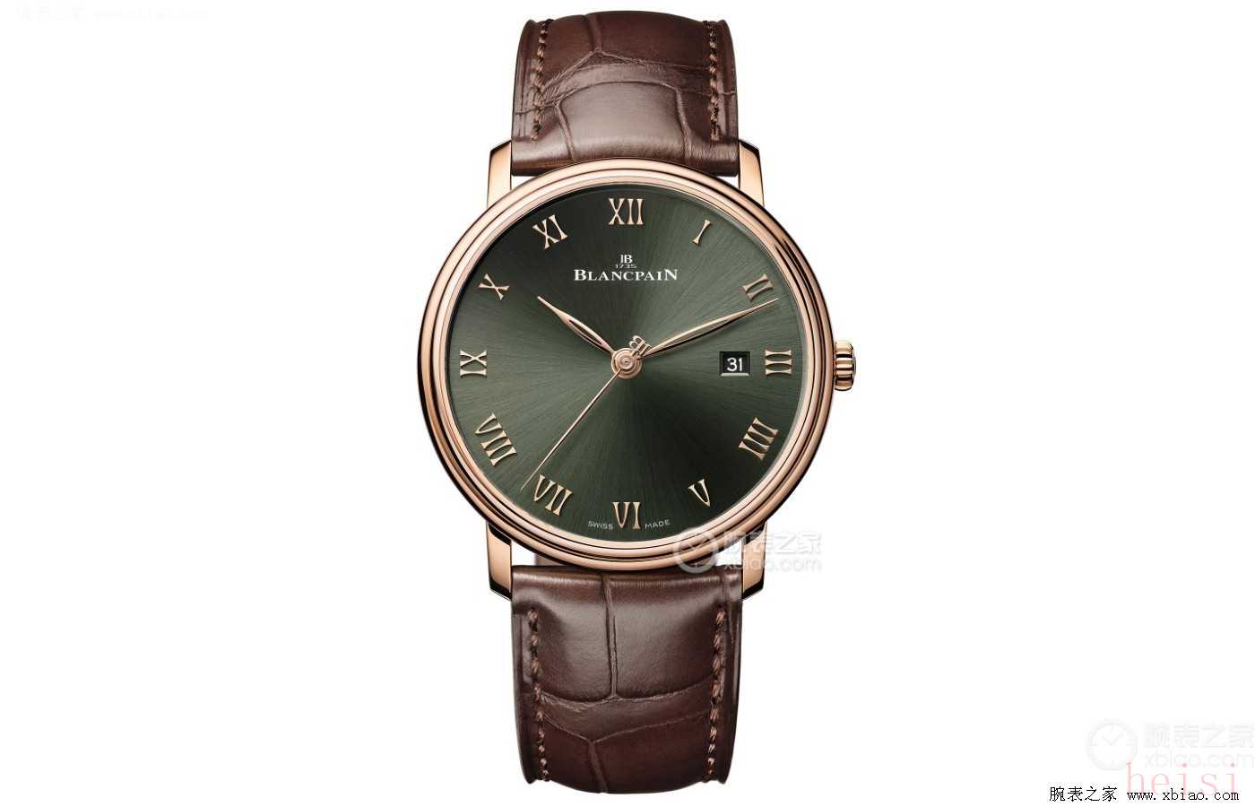 腕表點評:寶珀這只作為經典系列的延續(xù),從外觀和機芯都保持著不錯的水準。這只整體配色偏復古典雅,極光綠太陽放射紋路的盤面,搭配上手工鑲嵌的立體金色羅馬時標,以及金色柳葉針,視覺上看相當典雅。表帶使用棕色鱷魚皮,與綠色搭配起來相當和諧。表殼表冠均使用18k紅金,使得整只表看起來更加的貴氣有質感。從尺寸上看40毫米表徑8.7毫米表殼厚度,也是正裝表常用的尺寸,完全不需要擔心卡袖子。機芯上使用的是寶珀經典的Cal.1151自動上弦機芯,也是經典系列常用機芯。21600每小時振蕩次數,動能儲備能夠達到超長的100小時,即使4天不佩戴也無需調試。防水做到基礎的30米深度。
