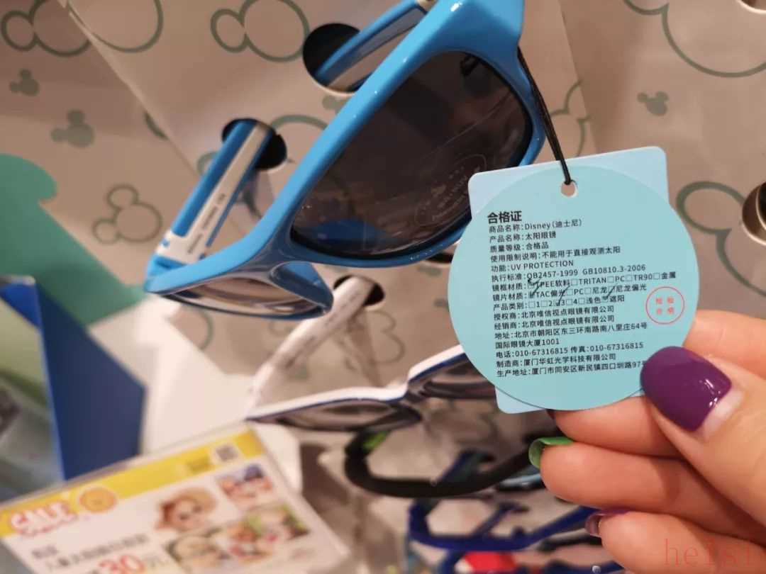 迪士尼是授權(quán)品牌,太陽鏡的實際經(jīng)銷商是“北京唯信視點有限公司”。我們發(fā)現(xiàn)成都市面上出售的該款兒童眼鏡基本都是偏光眼鏡,鏡片上貼有抗UV、偏光標(biāo)識。