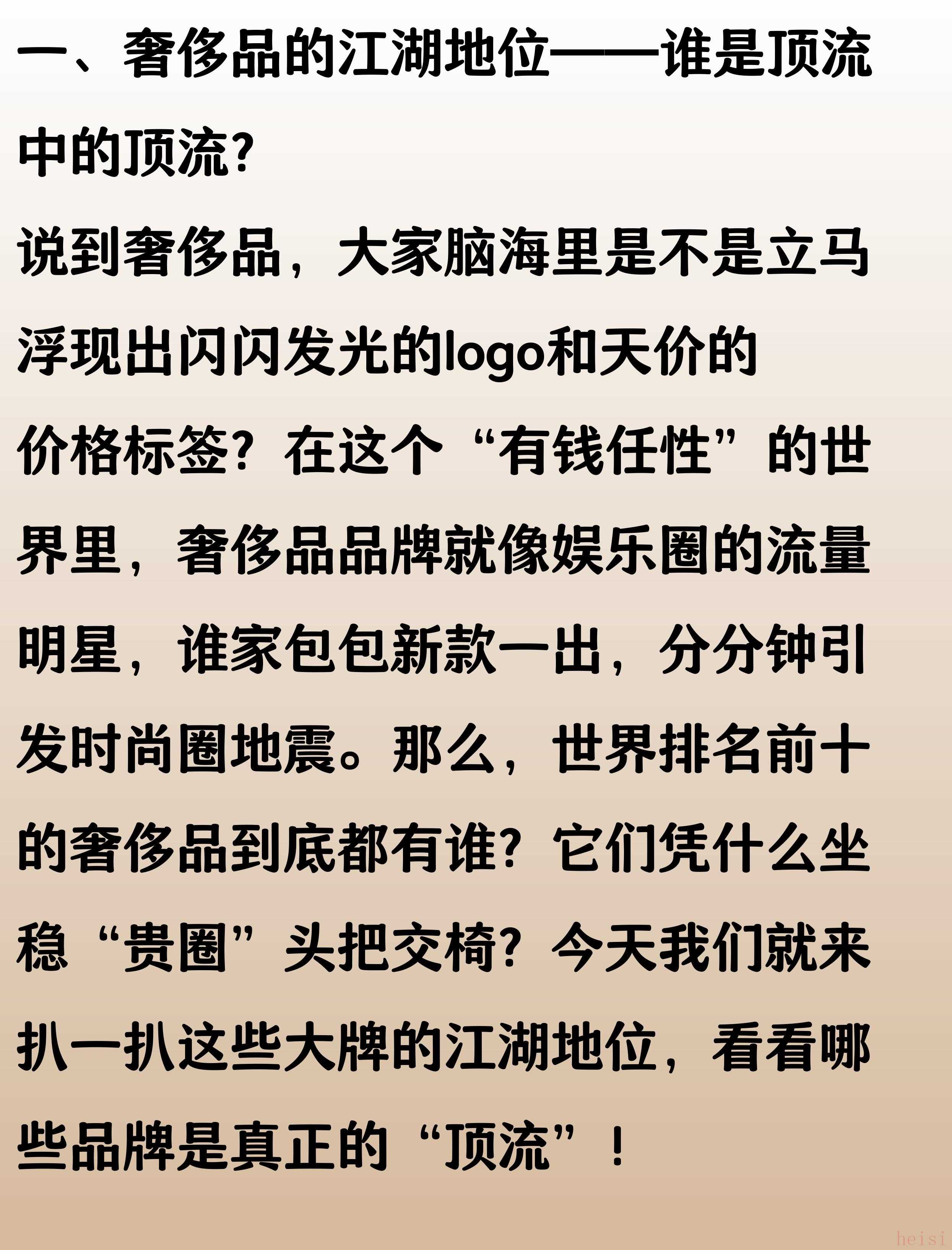 關于“世界排名前十位的奢侈品”,需要說明的是,并沒有一個全球公認的、統(tǒng)一的官方排名。奢侈品的排名通常會根據(jù)不同的標準(例如銷售額、品牌聲譽、創(chuàng)新能力、歷史意義、特定品類表現(xiàn)等)而有所差異。