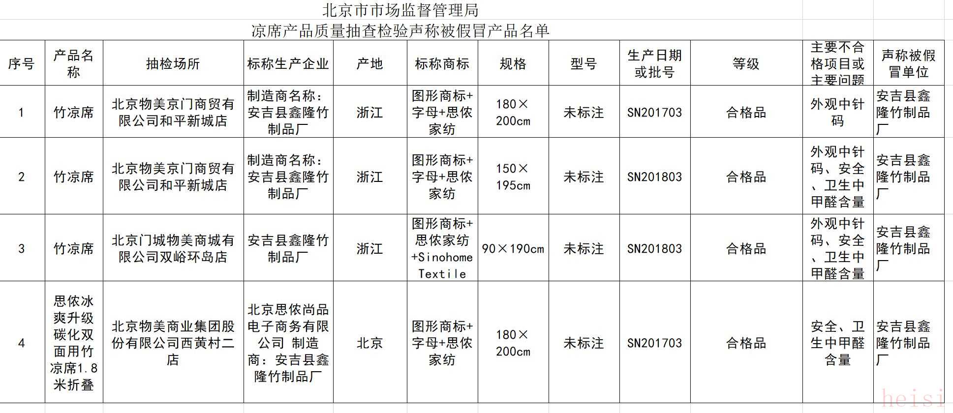 其中,2批次標(biāo)稱商標(biāo)為三水依夢(mèng)的產(chǎn)品不合格,分別是童藤席和碳化休閑竹席。2批次標(biāo)稱商標(biāo)為舒之家的冰爽木紋席不合格。1批次標(biāo)稱商標(biāo)為紅瑞家紡的高級(jí)碳化雙面席不合格。1批次標(biāo)稱商標(biāo)為天之錦的雅致寬涼席不合格。1批次標(biāo)稱商標(biāo)為真榮佳的真榮佳清水草單人席不合格。2批次標(biāo)稱商標(biāo)為普拉達(dá)的碳化雙面老板席不合格。1批次標(biāo)稱商標(biāo)為紅瑞紡織的高級(jí)碳化雙面席不合格。1批次標(biāo)稱商標(biāo)為舒之家+SHUZHIJIA的冰爽木紋席不合格。還有1批次標(biāo)稱商標(biāo)為艾睡寶的鏡面烏竹席不合格。