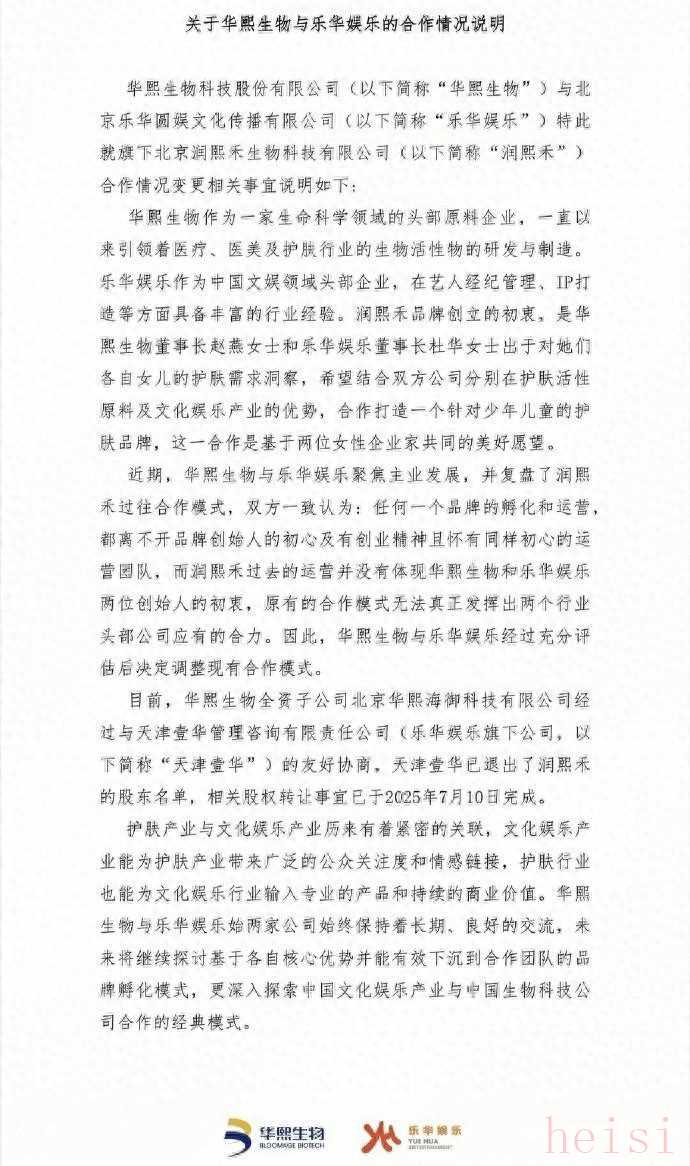 因此,華熙生物全資子公司北京華熙海御科技有限公司經過與天津壹華管理咨詢有限責任公司(樂華娛樂旗下公司,以下簡稱“天津壹華”)的友好協(xié)商,天津壹華已退出了潤熙禾的股東名單,相關股權轉讓事宜已于2025年7月10日完成。