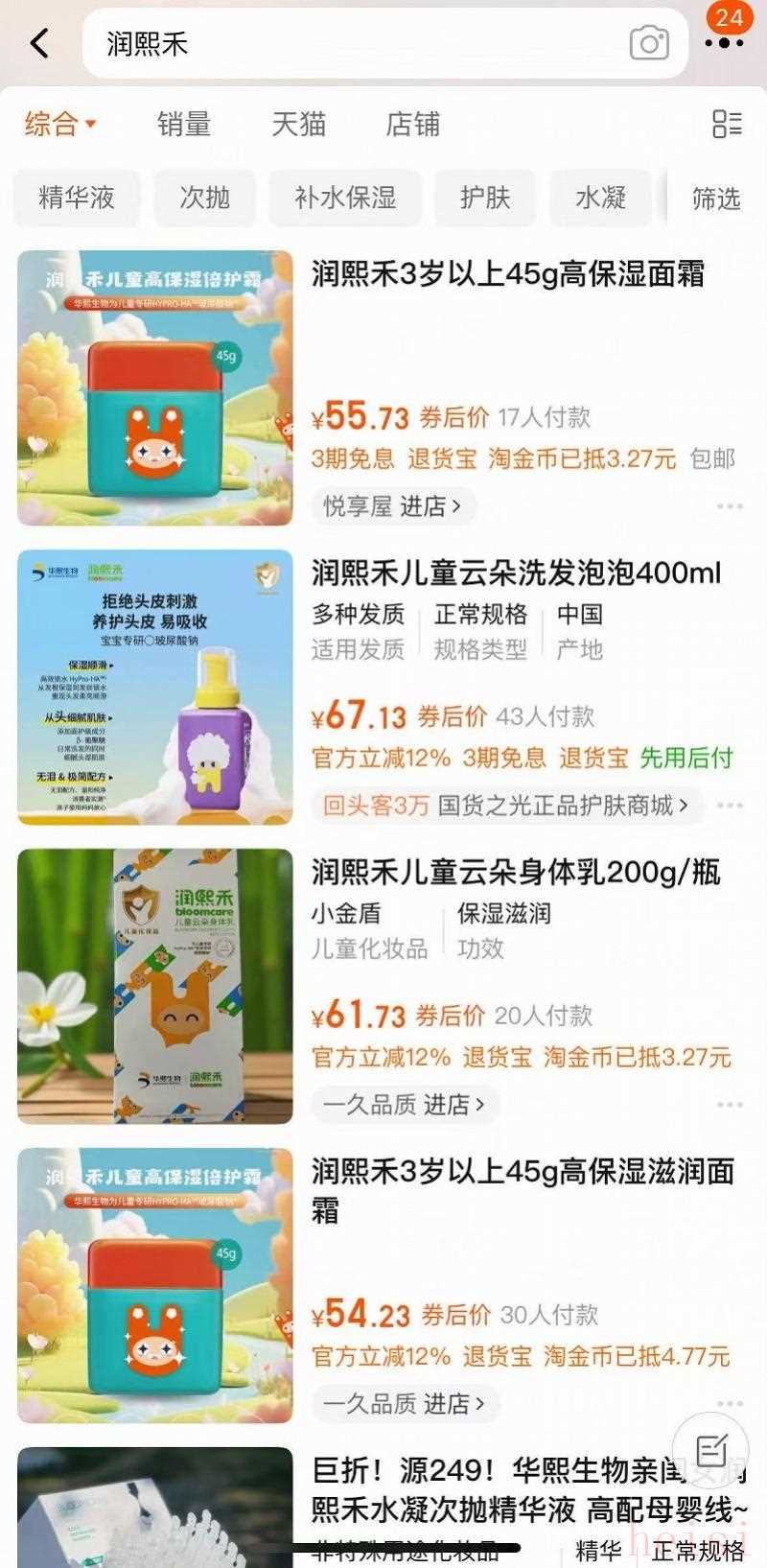 目前,在華熙生物的官網上依然能看到“潤熙禾”位于其護膚品牌的矩陣之中,對品牌的宣傳為“華熙生物唯一兒童品牌”,羅列出的產品包括潔面、保濕霜、沐浴露、潤唇膏和護手霜。